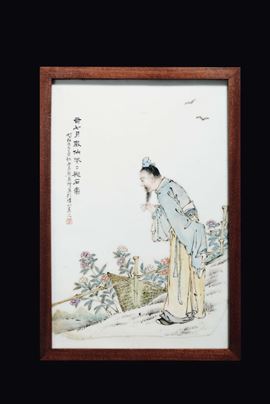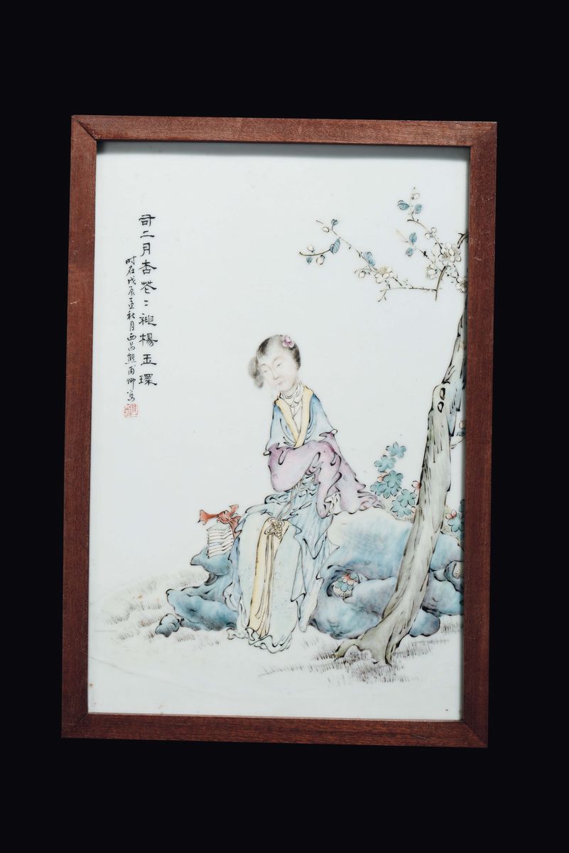 Due placche in porcellana policroma raffiguranti una Guanyin e un dignitario anziano con iscrizioni, Cina, XX secolo