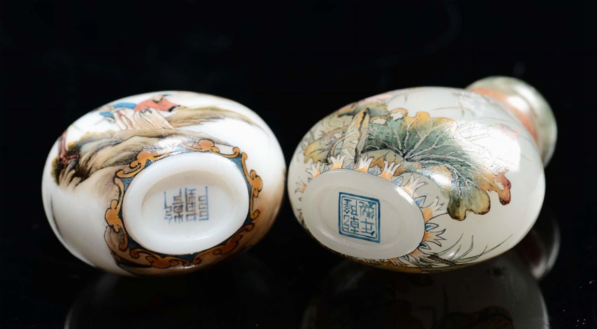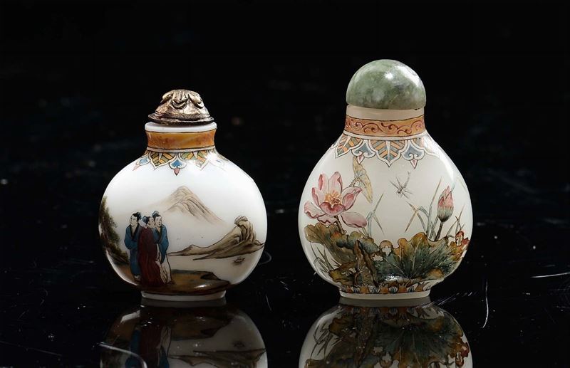 Due snuff bottles una in porcellana e una in vetro con pescatori e ninfee, Cina, Dinastia Qing, XIX secolo