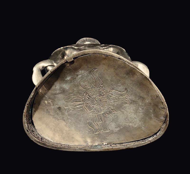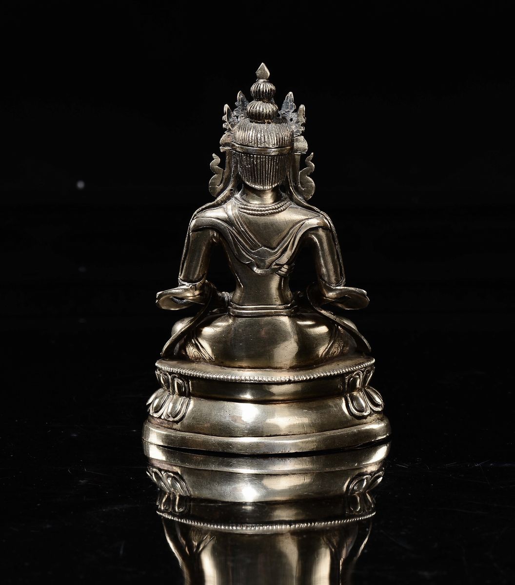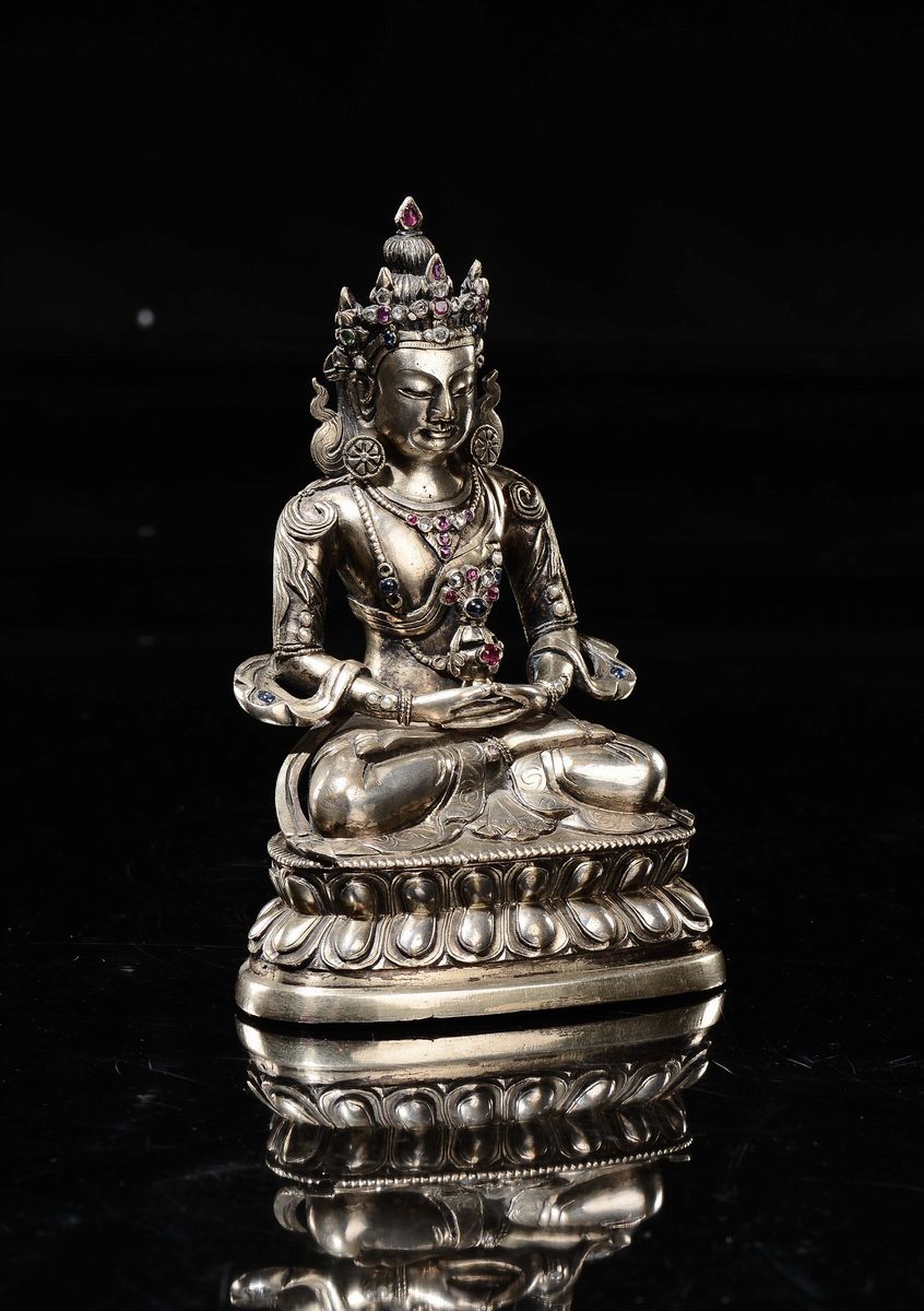 Figura di Amitayus in bronzo argentato con innesti di pietre dure, Tibet, XVIII secolo