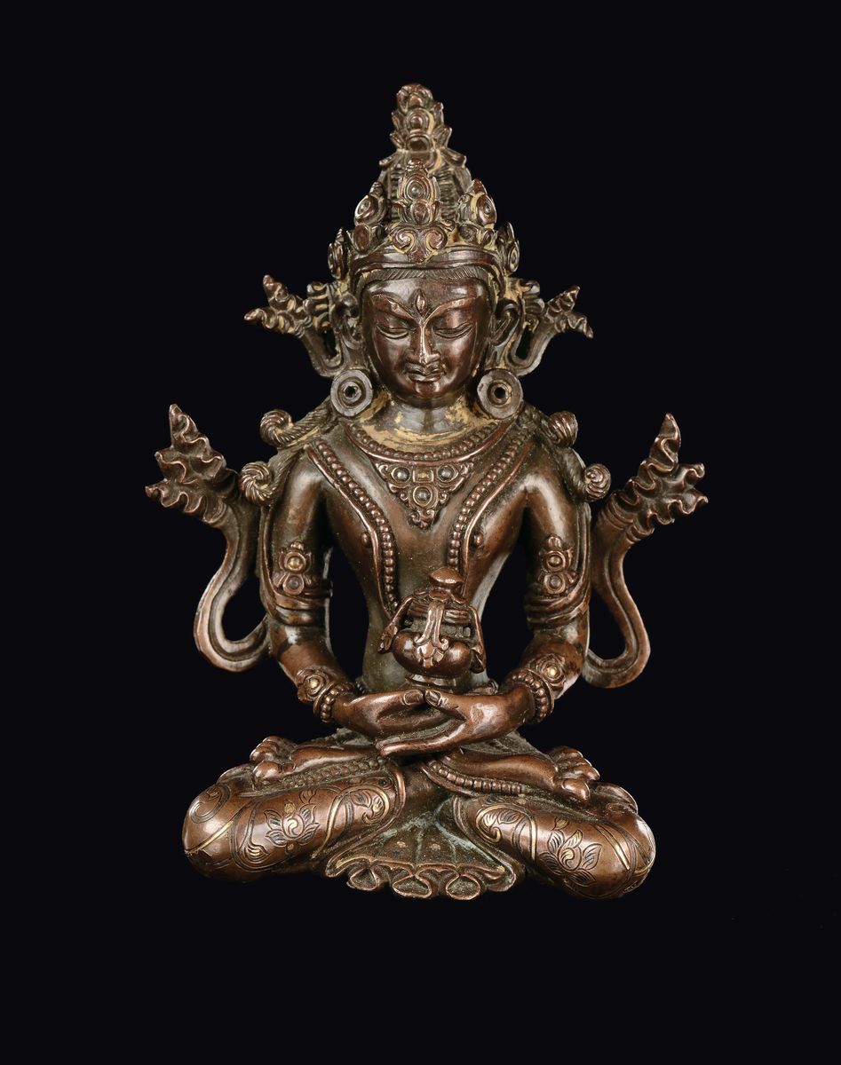 Figura di Amitayus in bronzo dorato , Tibet, XVII secolo