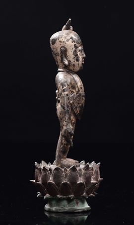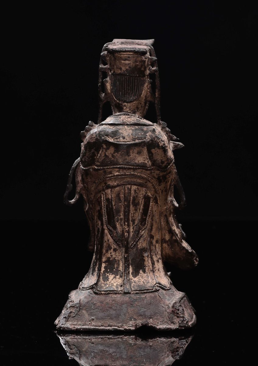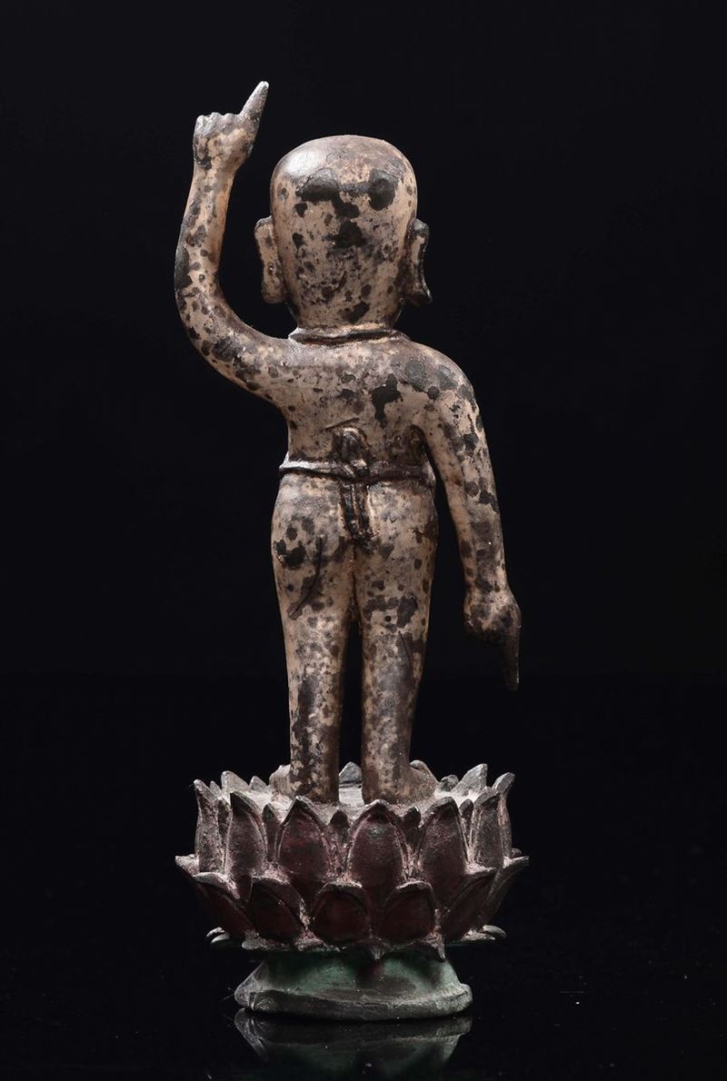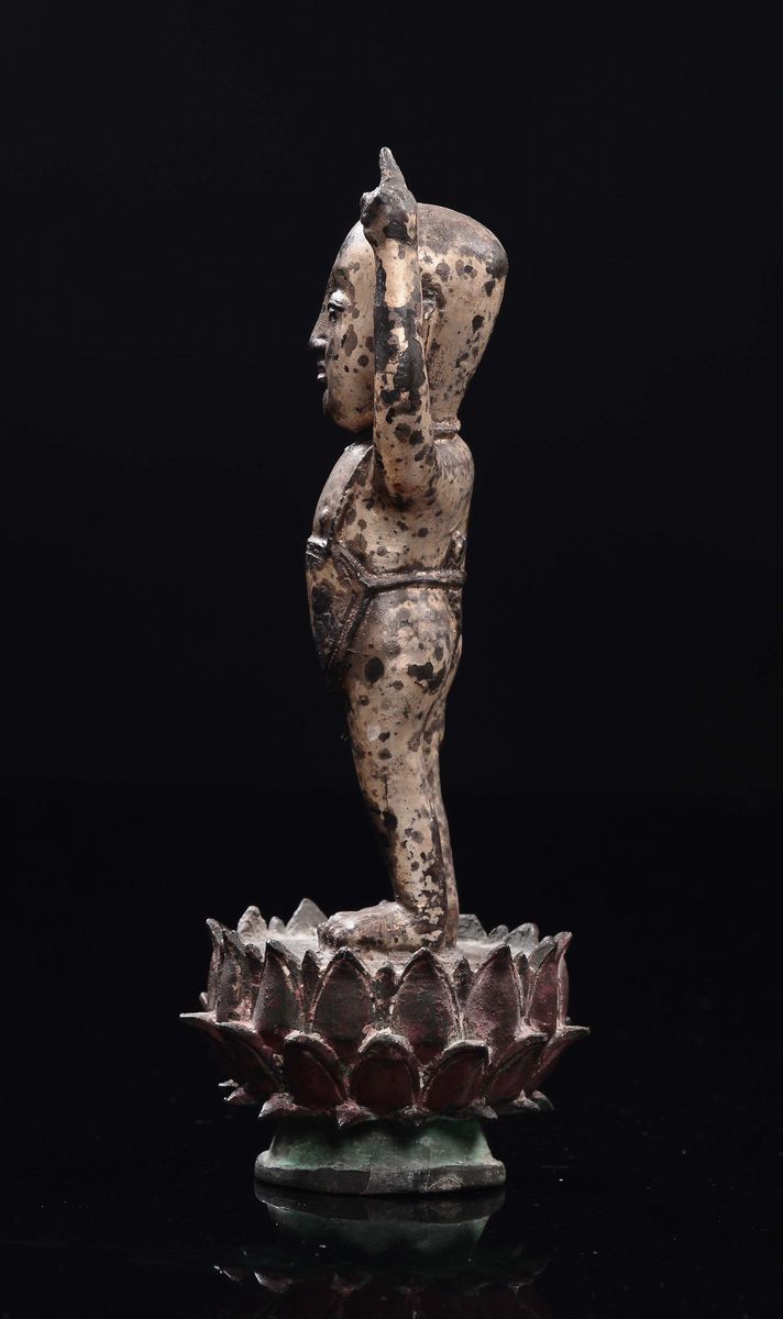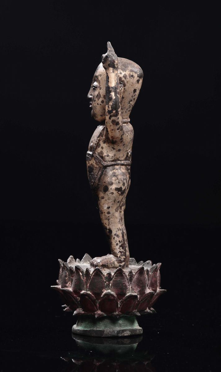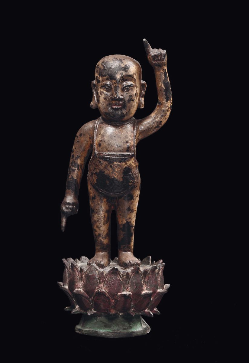 Figura di Budai bambino eretto su fiore di loto e figura di dignitario in bronzo dorato a freddo, Cina, Dinastia Ming, XVII [..]