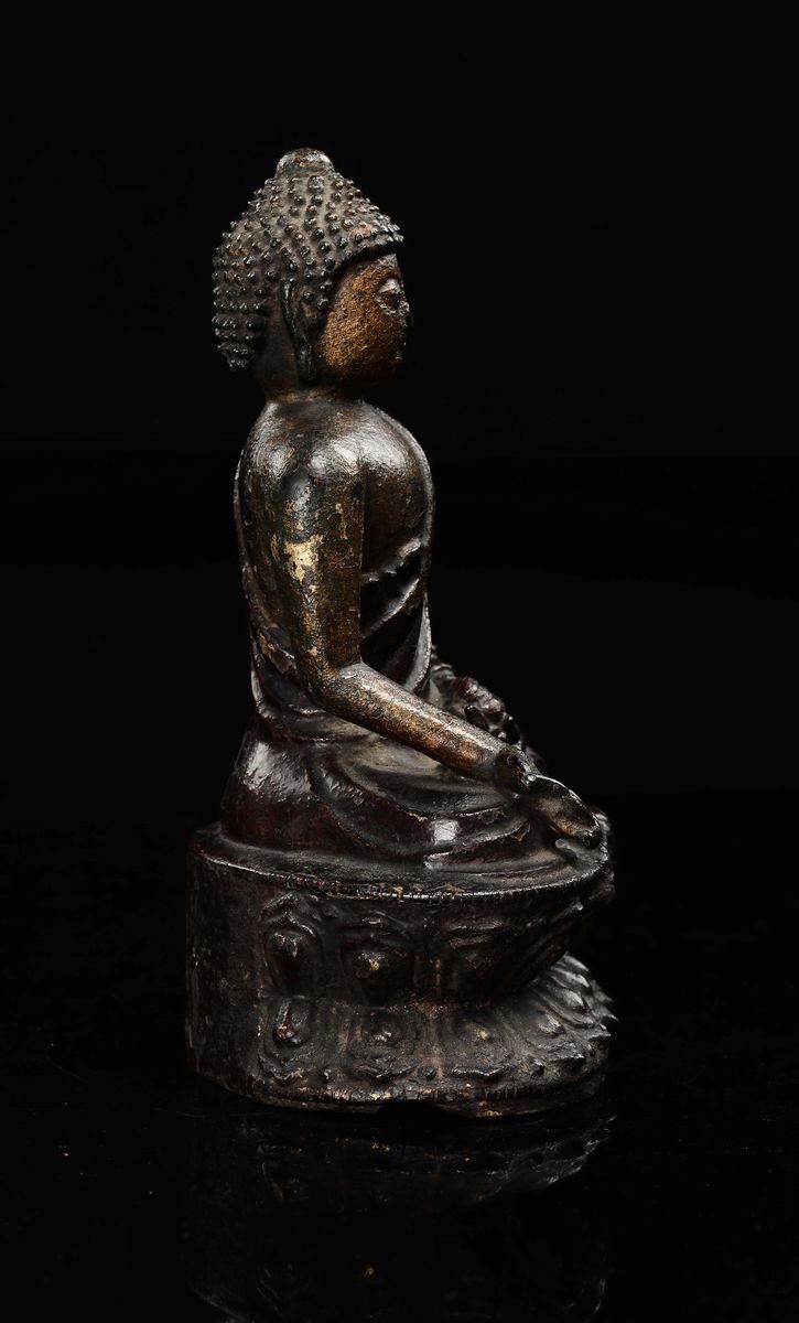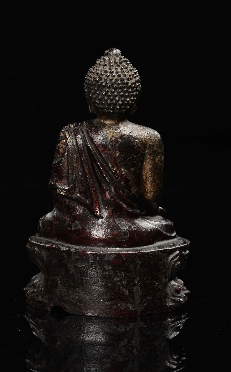 Figura di Buddha in bronzo con tracce di doratura seduto su doppio fiore di loto, Cina, Dinastia Ming, XVII secolo