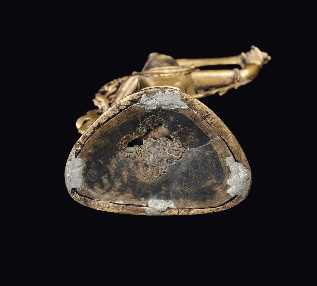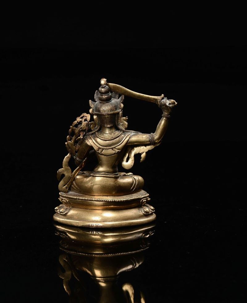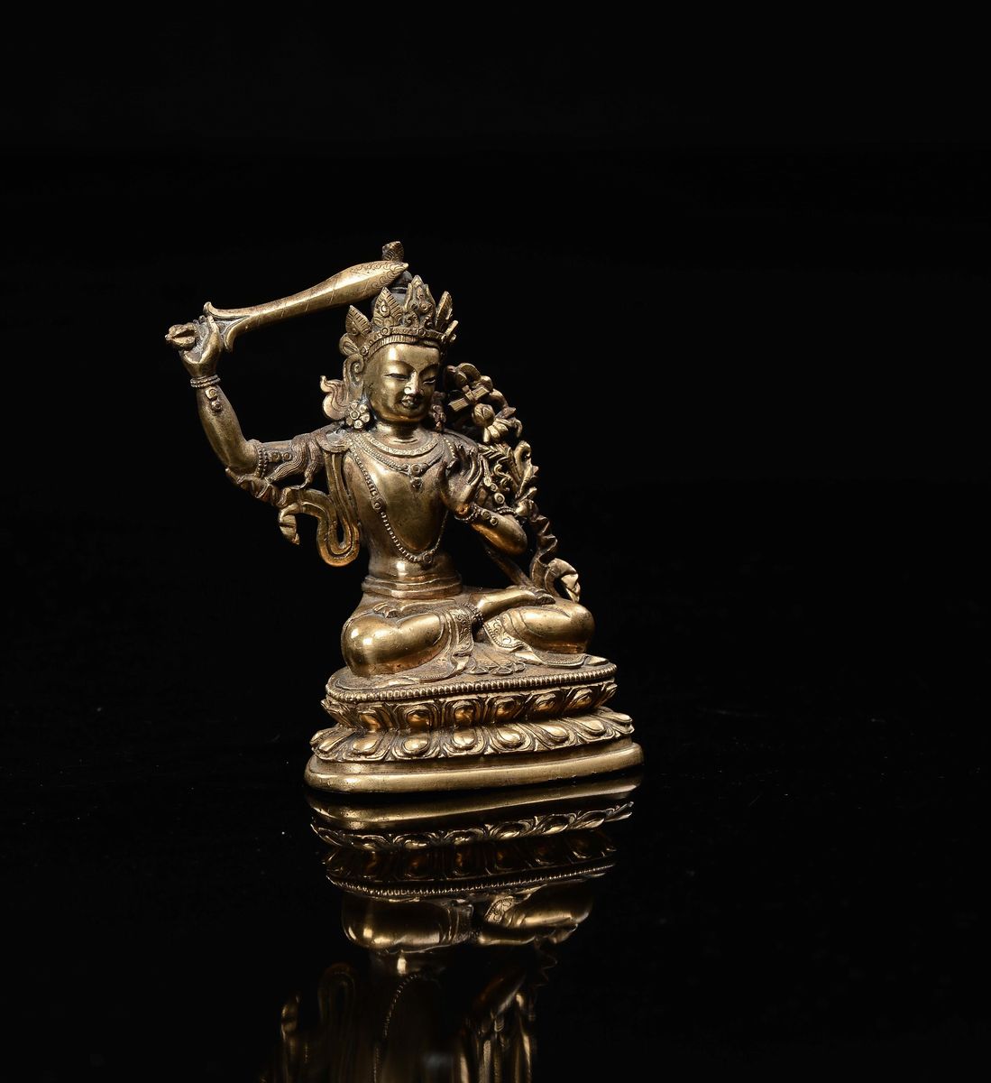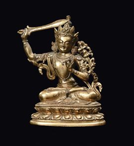 Figura di Manjushri in bronzo dorato su doppio fiore di loto, Tibet, XVIII secolo