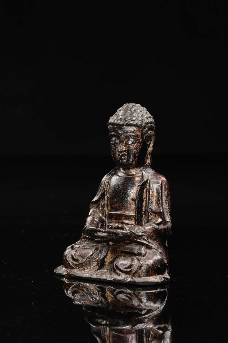 seduta in dhyanasana, mano sinistra in vitarkamudra e mano destra sollevata sopra la testa che regge una spada. Adornata da gioielli a perline, indossa una tiara poggiata su fronte e spalle.h cm 10