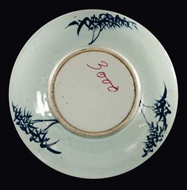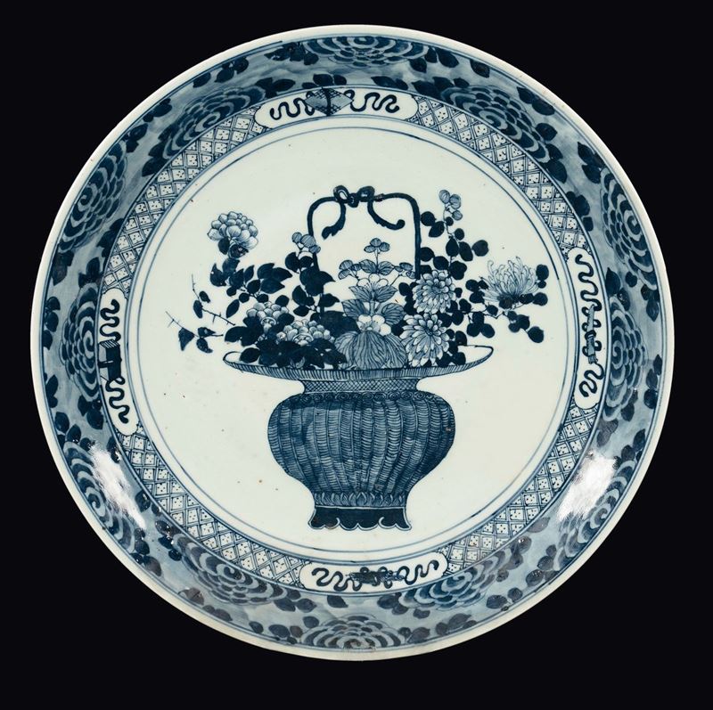 Grande piatto in porcellana bianca e blu con cestino di fiori, Cina, Dinastia Qing, epoca Qianlong (1736-1795)