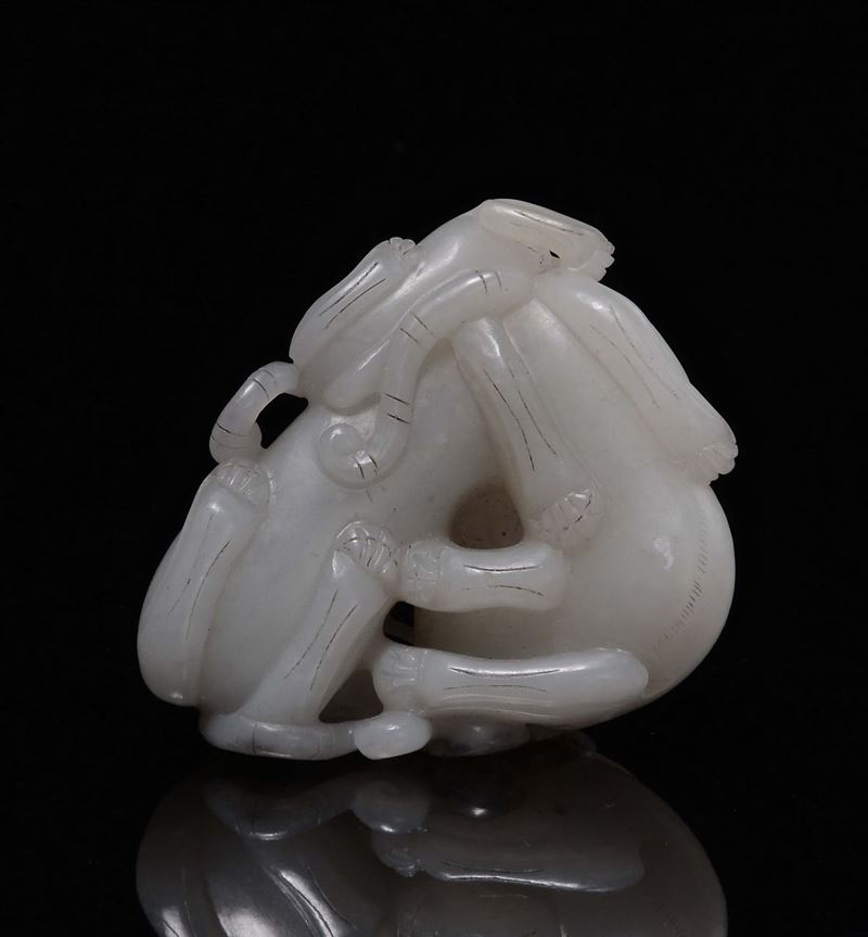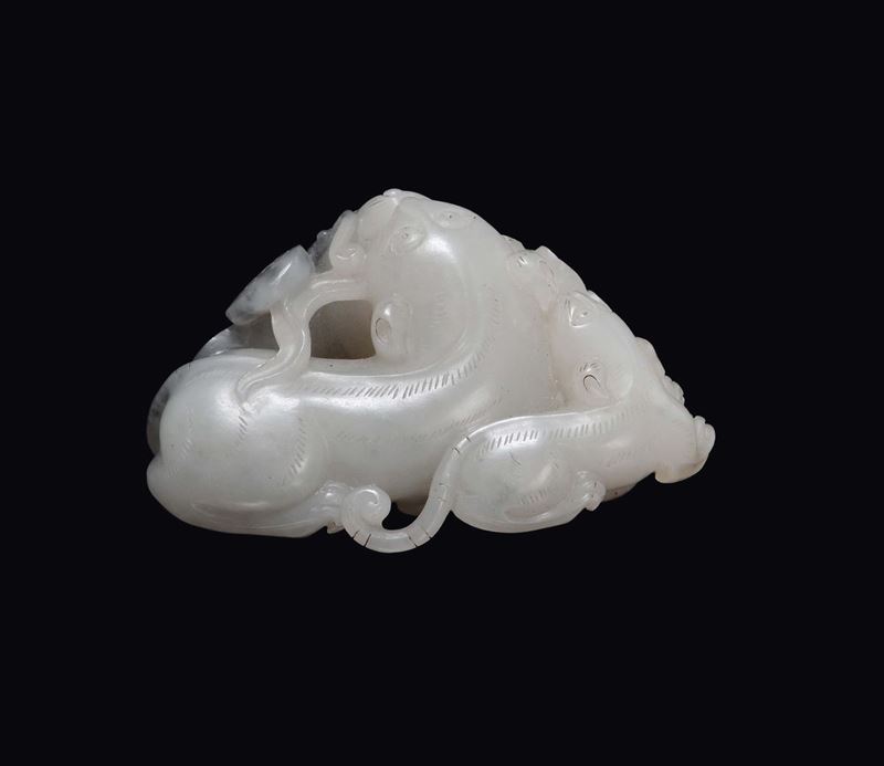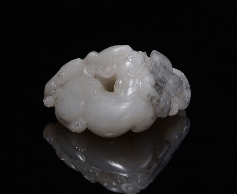 Gruppo in giada bianca e russet raffigurante tre gatti e una farfalla, Cina, Dinastia Qing, XVIII secolo