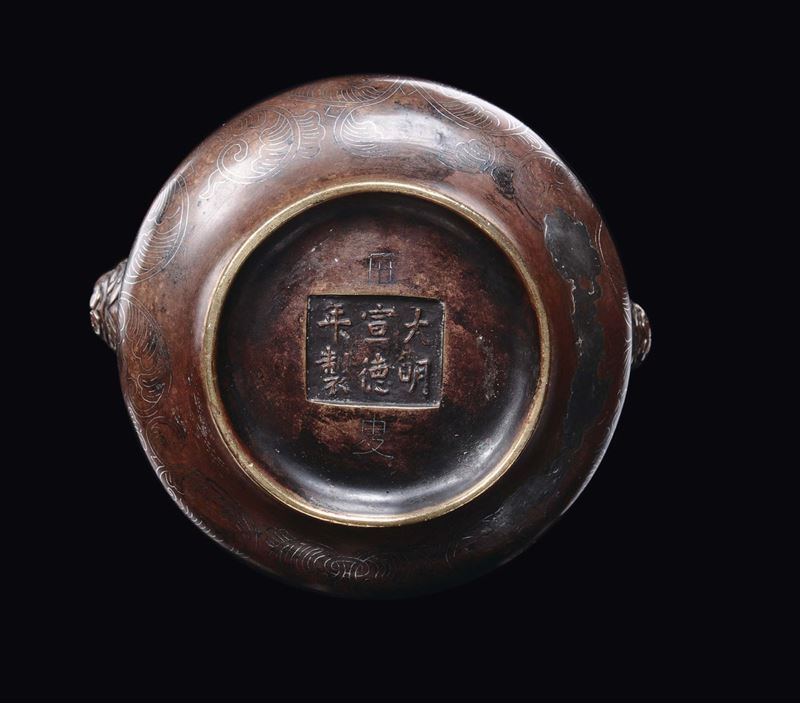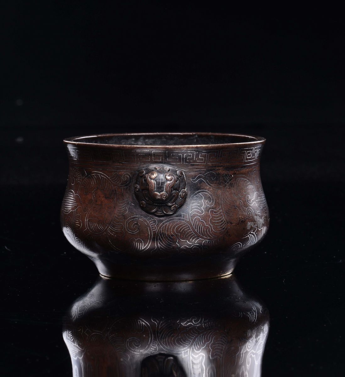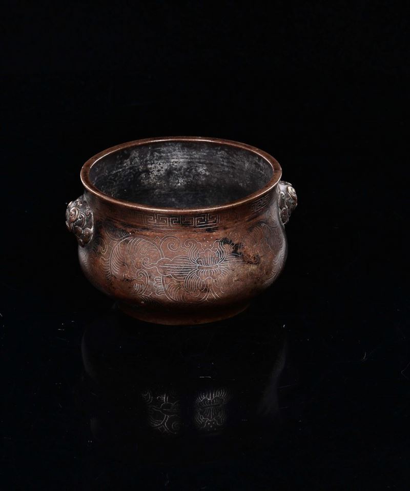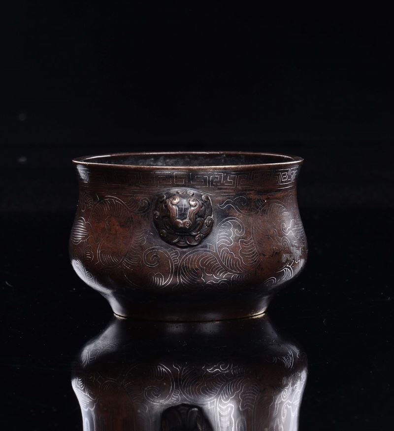 Incensiere in bronzo con orchidee stilizzate e decoro geometrico di gusto arcaico, Cina, Dinastia Ming, XV secolo