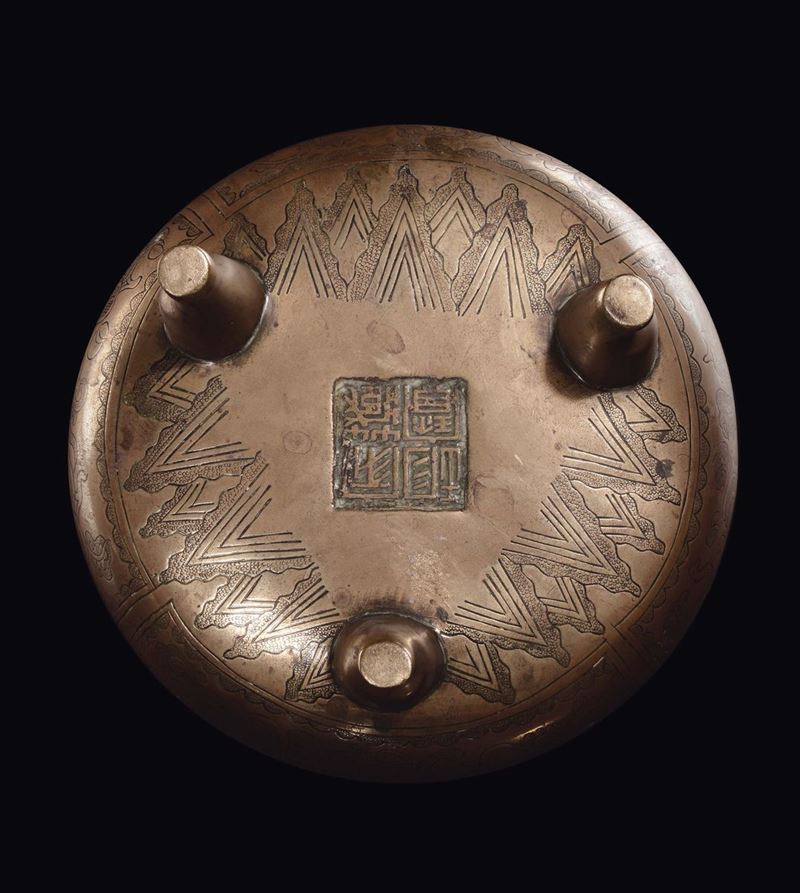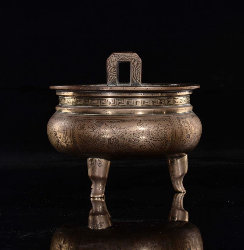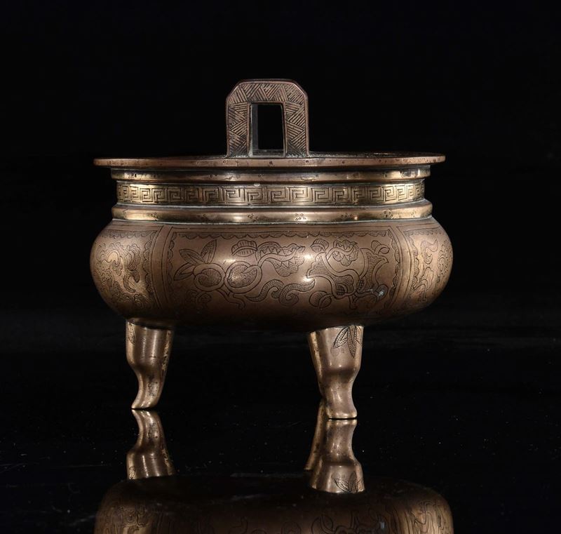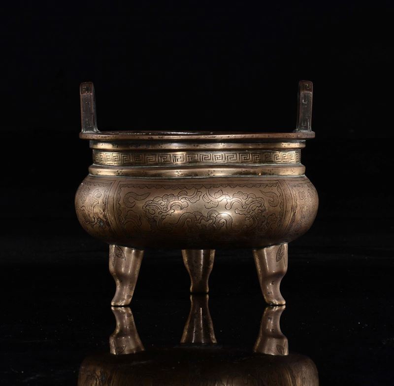 Incensiere in bronzo dorato con manici e decoro d'ispirazione arcaica, Cina, Dinastia Qing, XIX secolo