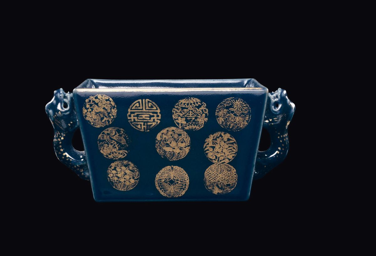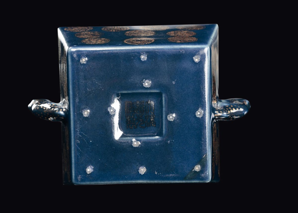 Incensiere in porcellana a fondo blu con decoro oro con anse a forma di animale, Cina, Dinastia Qing, marca e del periodo Daoguang (1821-1850)