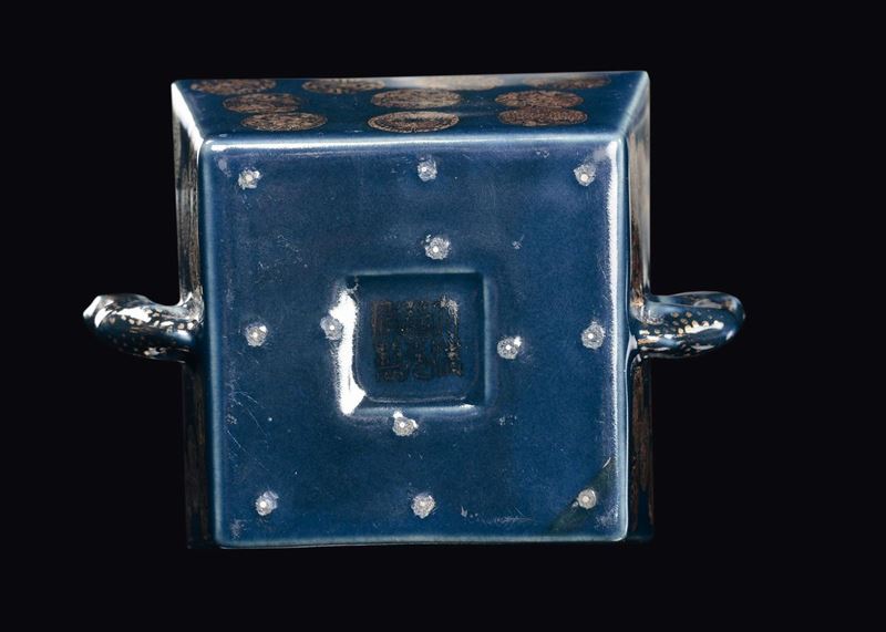 Incensiere in porcellana a fondo blu con decoro oro con anse a forma di animale, Cina, Dinastia Qing, marca e del periodo [..]