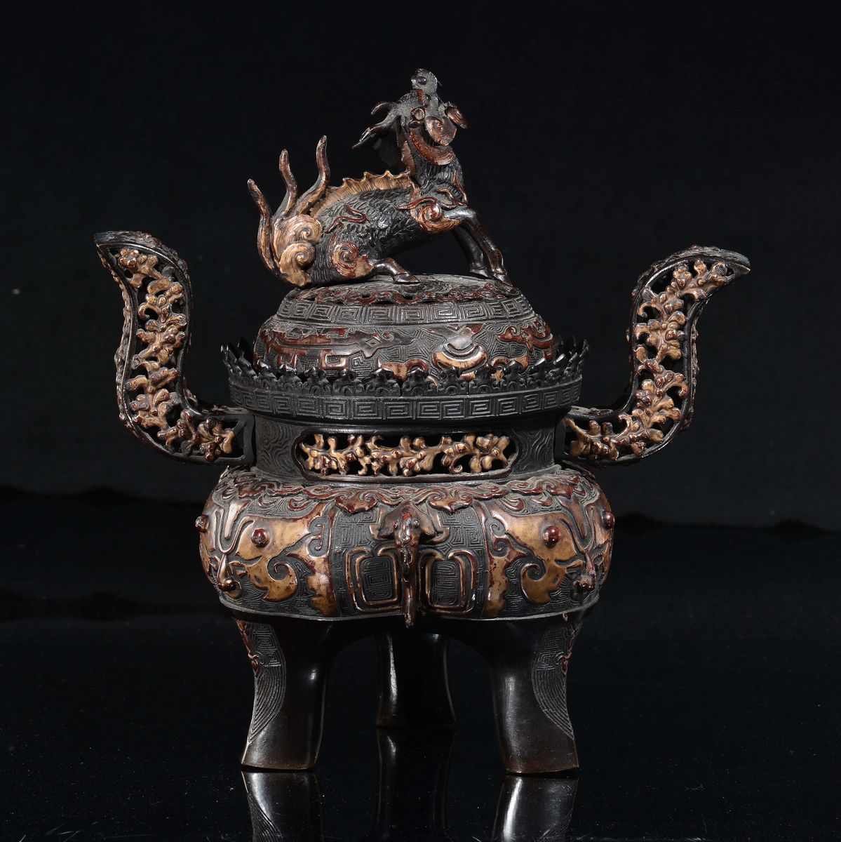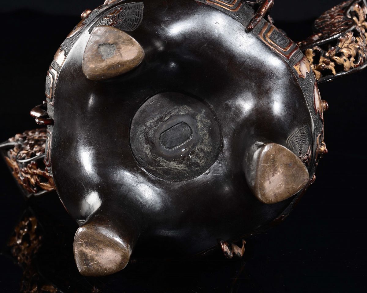 Incensiere tripode con coperchio in bronzo laccato e dorato, Cina, Dinastia Qing, epoca Qianlong (1736-1795)