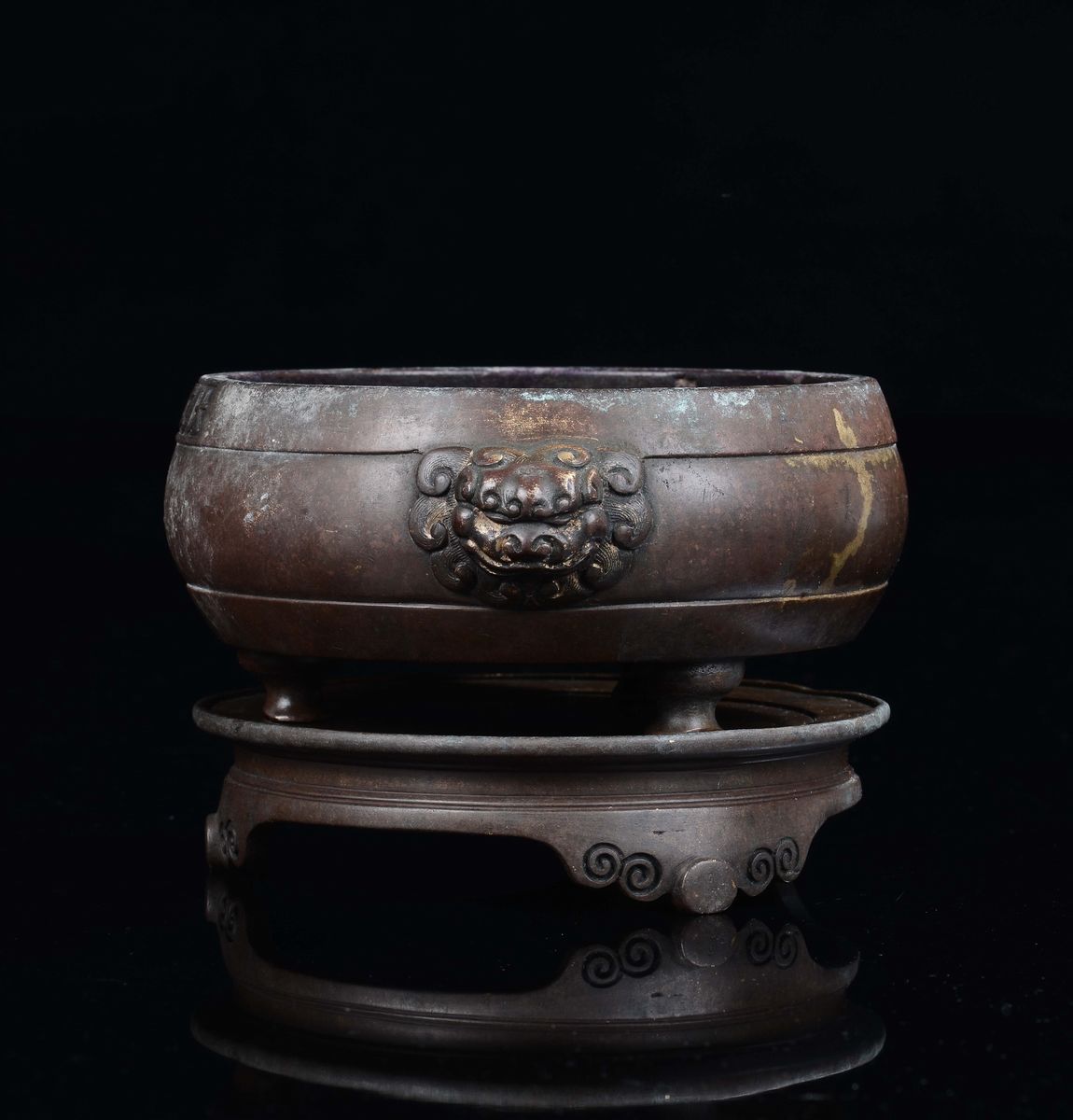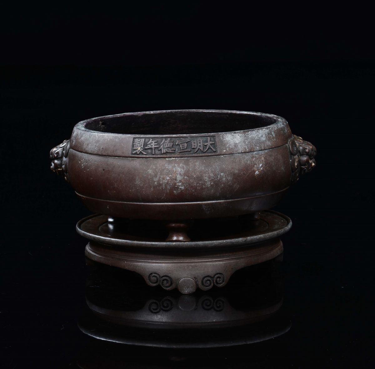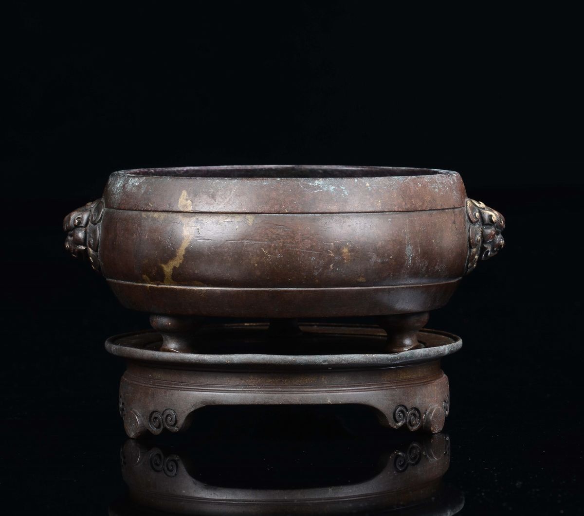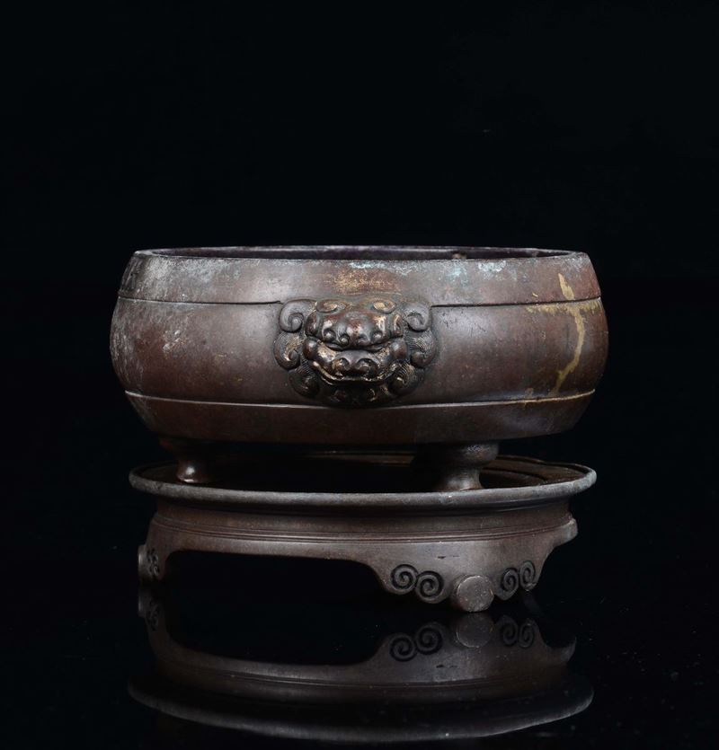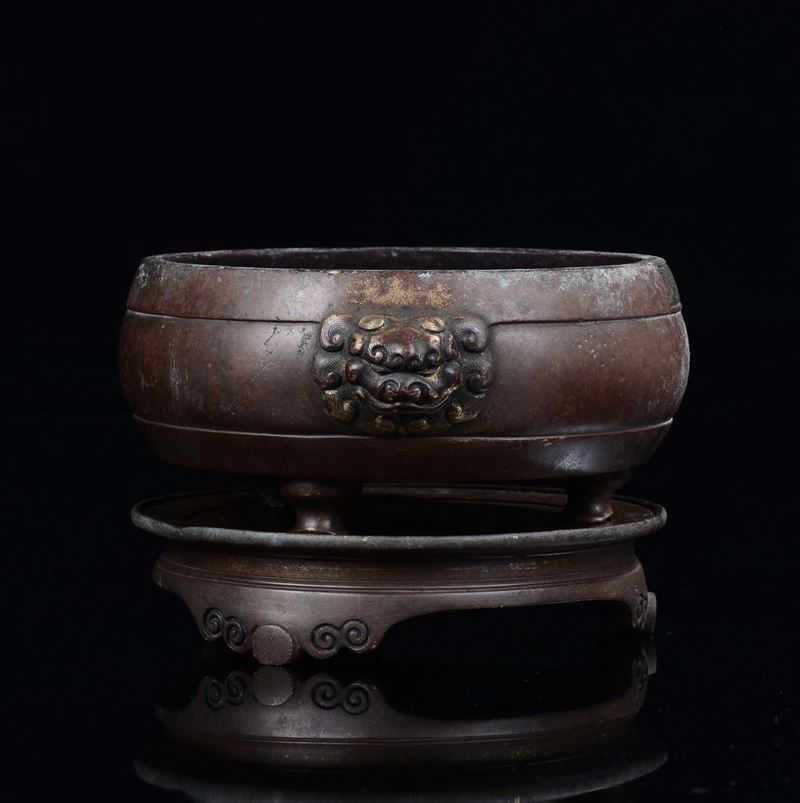Incensiere tripode in bronzo con alzata e manici a maschera taotie, Cina, Dinastia Ming, XV secolo