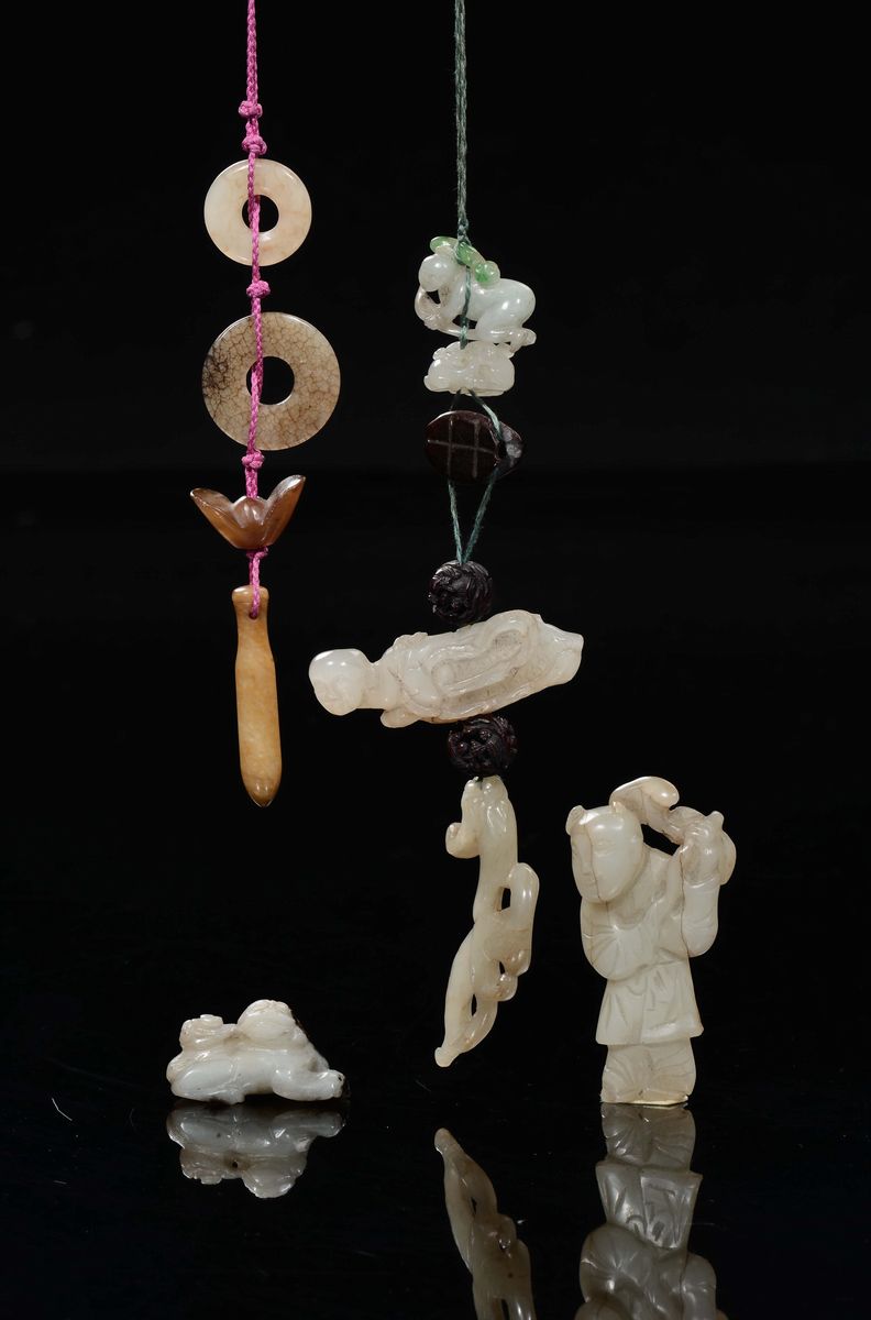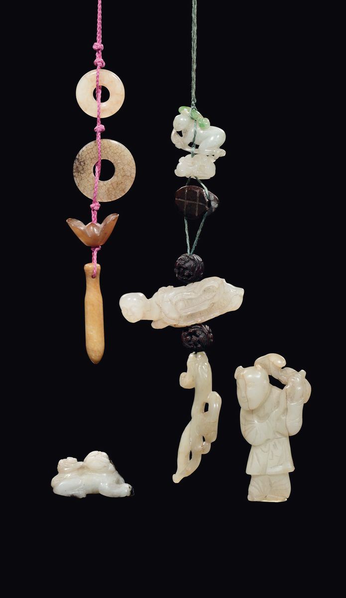 Lotto di giade bianche e russet composto da due pendenti, una scultura di fanciullo e un piccolo cane di Pho, Cina, Dinastia [..]