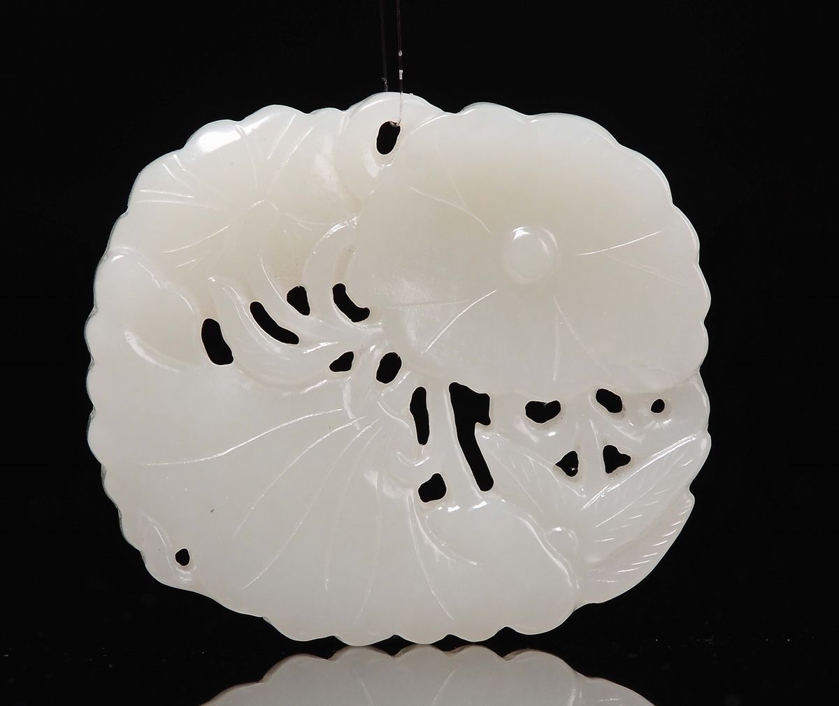 Lotto di tre giade bianche Celadon, una scolpita a guisa di pesce, un gruppo scolpito a melograno con bambino e un pendente a guisa di fiore, Cina, Dinastia Qing, XIX secolo