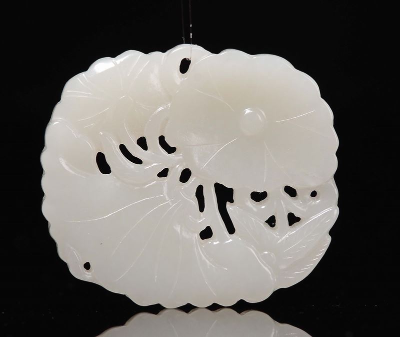 Lotto di tre giade bianche Celadon, una scolpita a guisa di pesce, un gruppo scolpito a melograno con bambino e un pendente [..]
