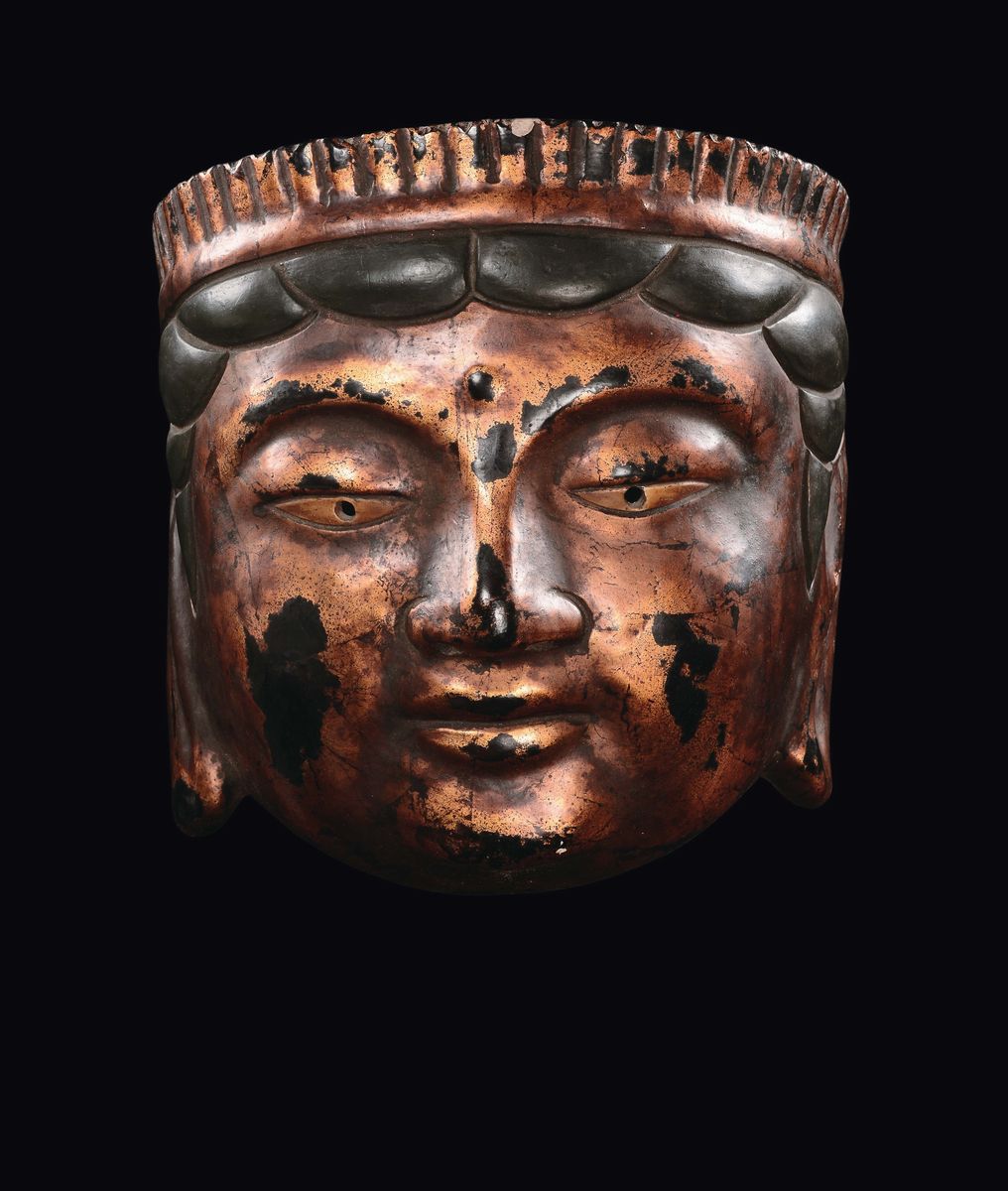 Maschera in bronzo lumeggiato e dipinto con volto di divinità, Giappone, epoca Edo, XVII secolo