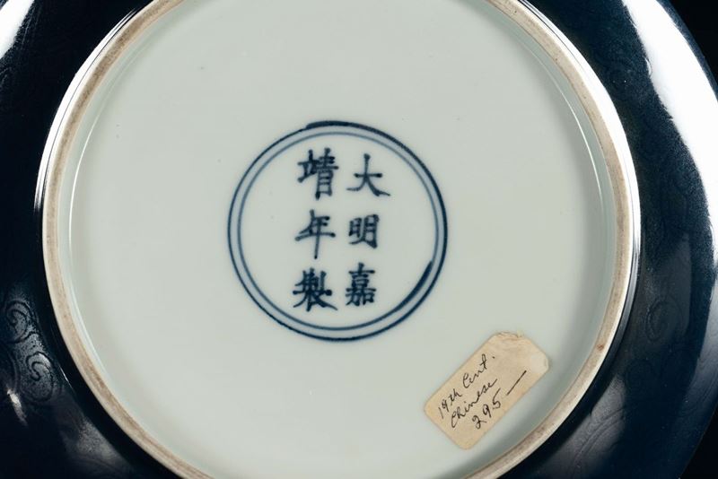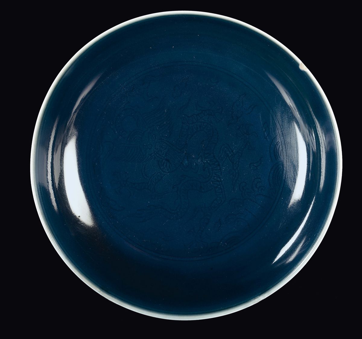 Piatto in porcellana monocroma blu decoro floreale di stampo arcaico, Cina, Dinastia Qing, XIX secolo