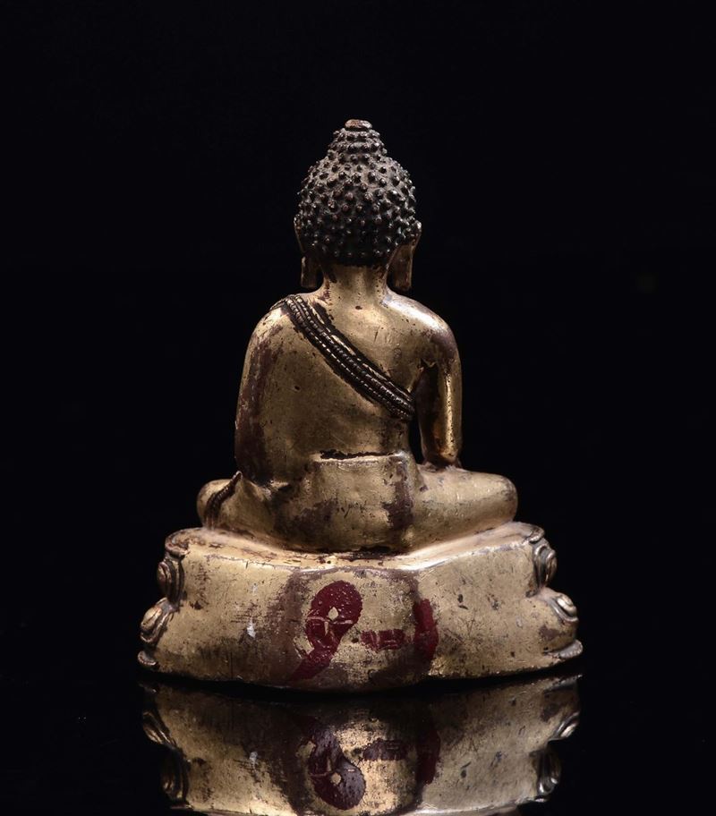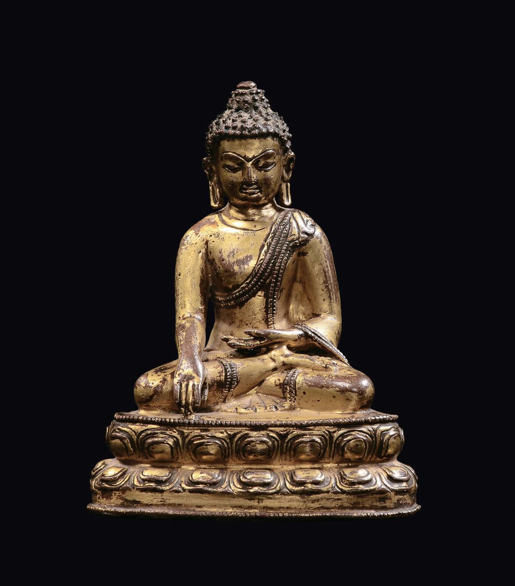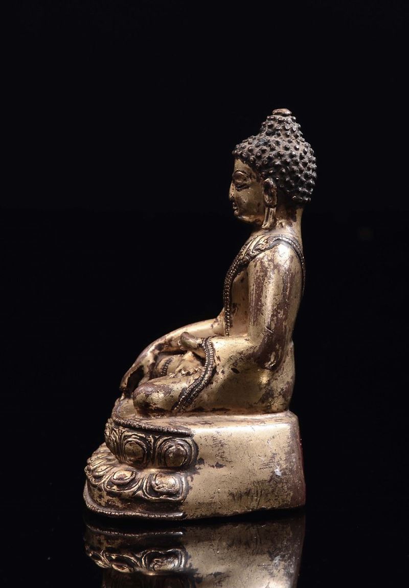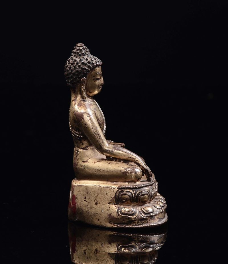 Piccolo Buddha in bronzo dorato seduto su doppio fiore di loto, Tibet, XVII secolo