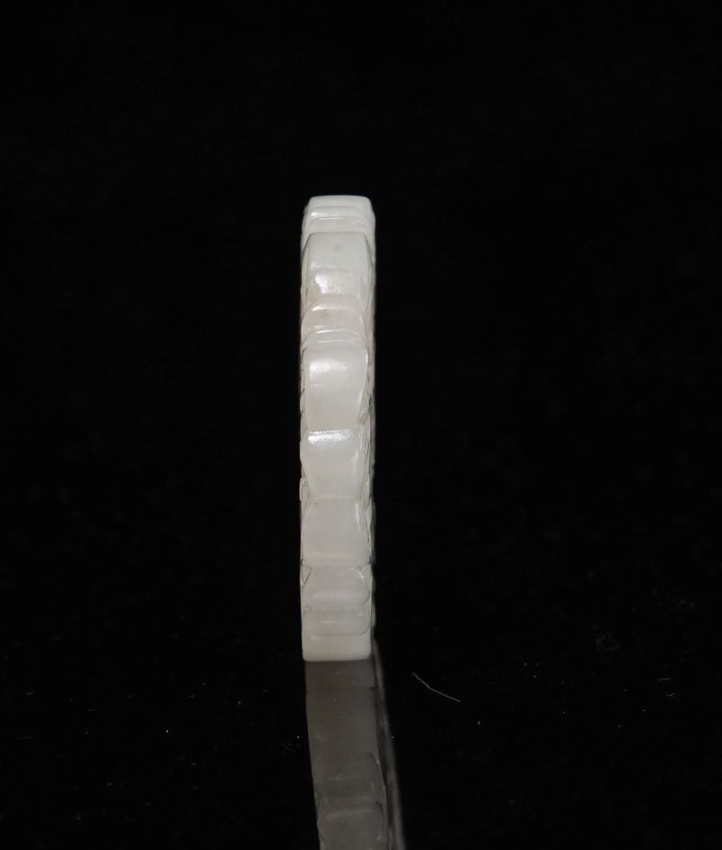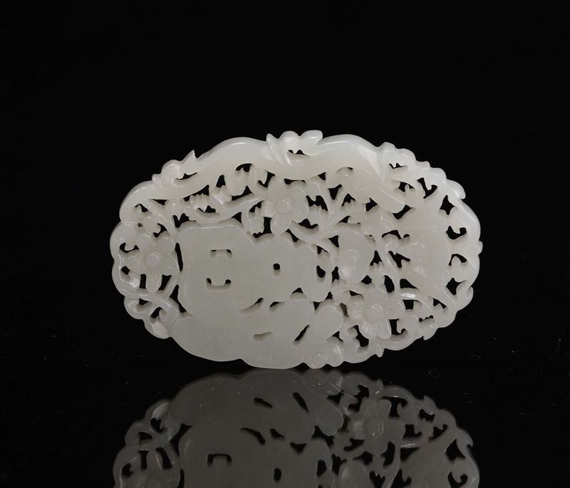 Placca in giada bianca traforata con decoro di fiori, pipistrello e immagini stilizzate, Cina, Dinastia Qing, XIX secolo