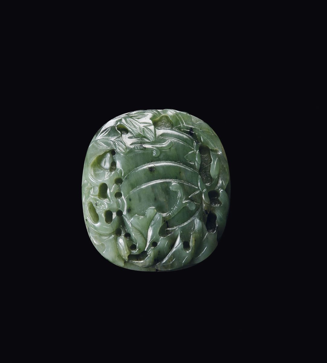 Placchetta in giada spinacio con due zucche e foglie in rilievo, Cina, Dinastia Qing, XIX secolo