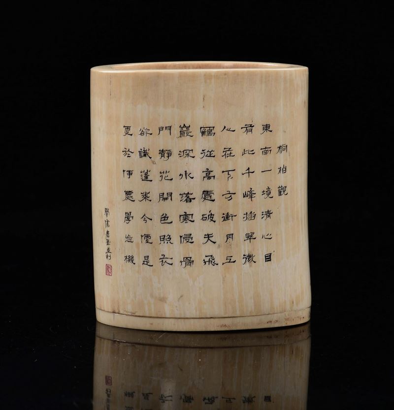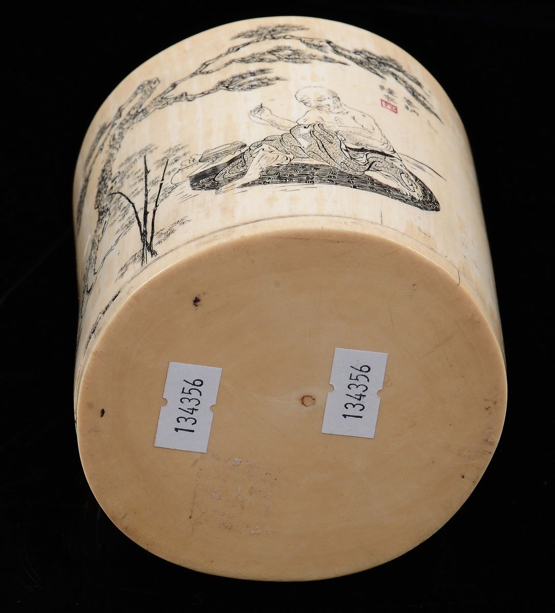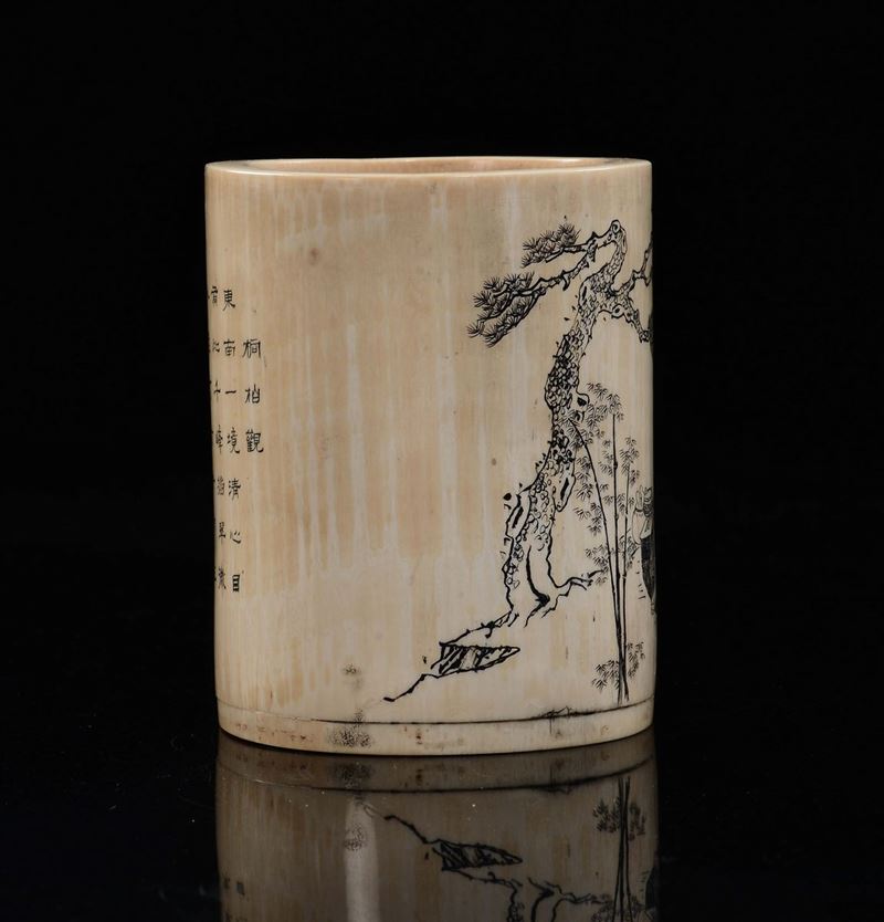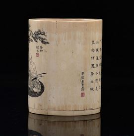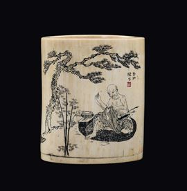 Portapennelli in avorio inciso con ideogrammi e figure, Cina, inizio XX secolo
