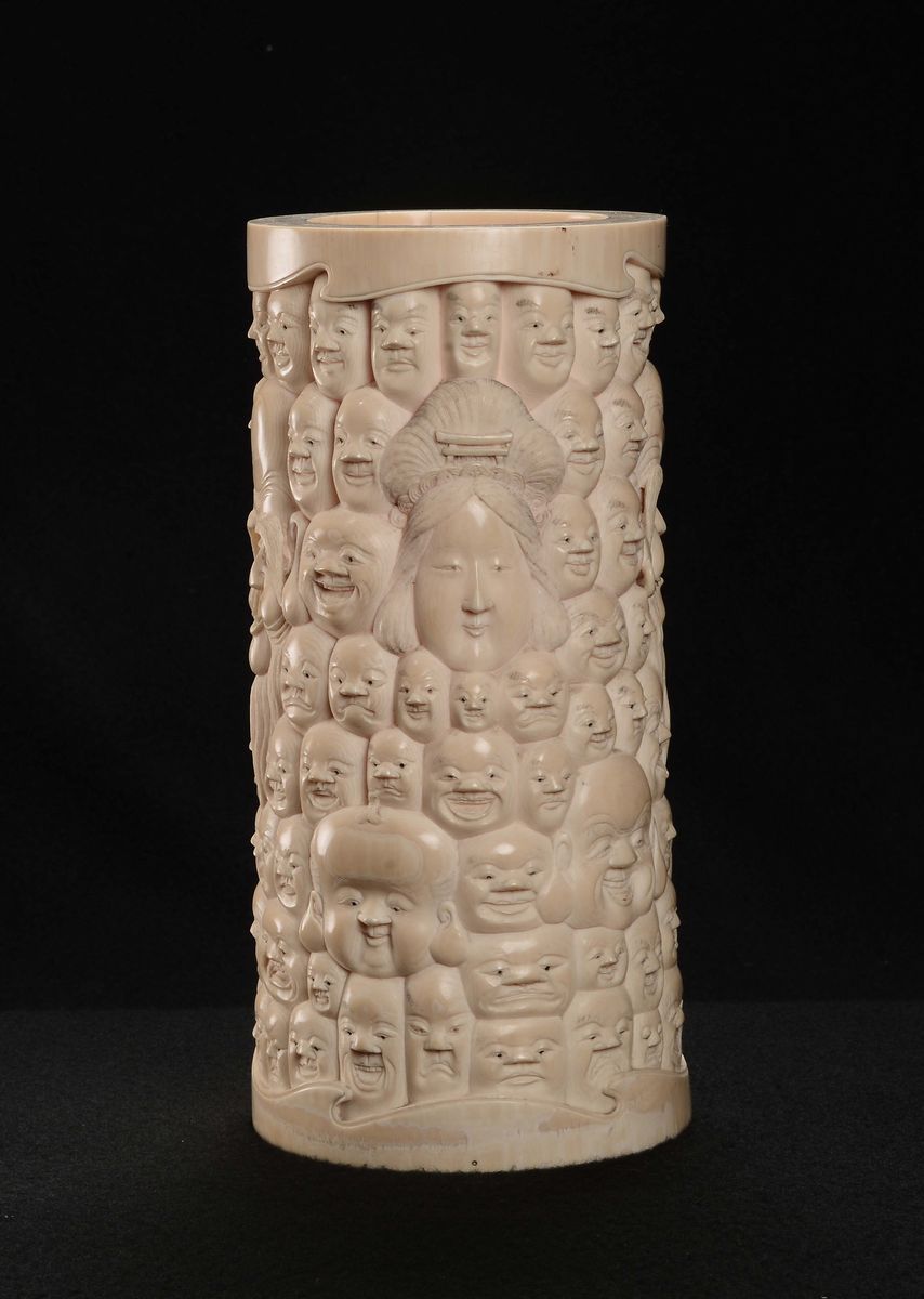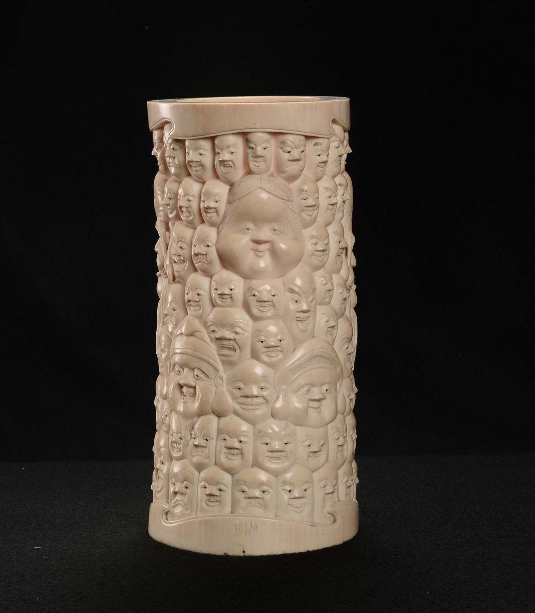Portapennelli in avorio scolpito con mille volti di saggi e Guanyin, Giappone, epoca Meiji, fine XIX secolo
