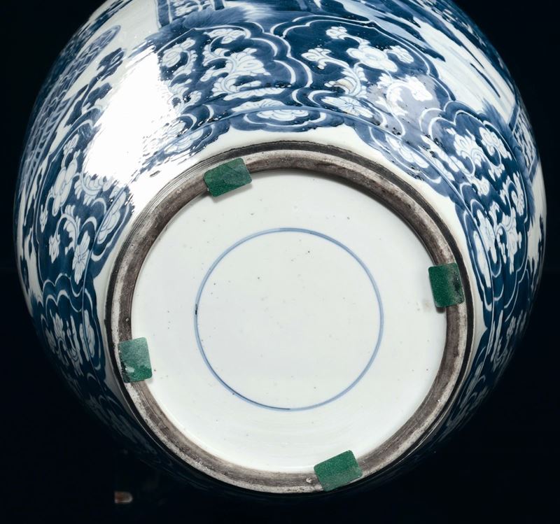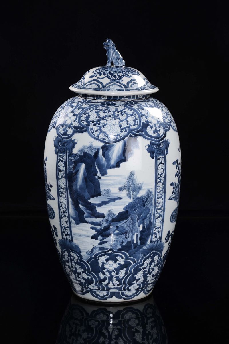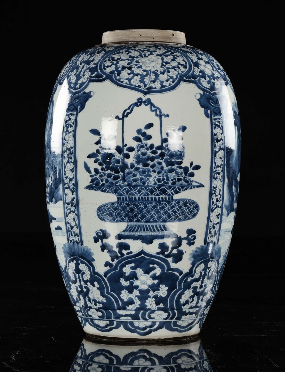 Potiche con un coperchio in porcellana bianca e blu con riserve contenenti vasi di fiori, Cina, Dinastia Qing, il vaso epoca Kangxi (1662-1722)