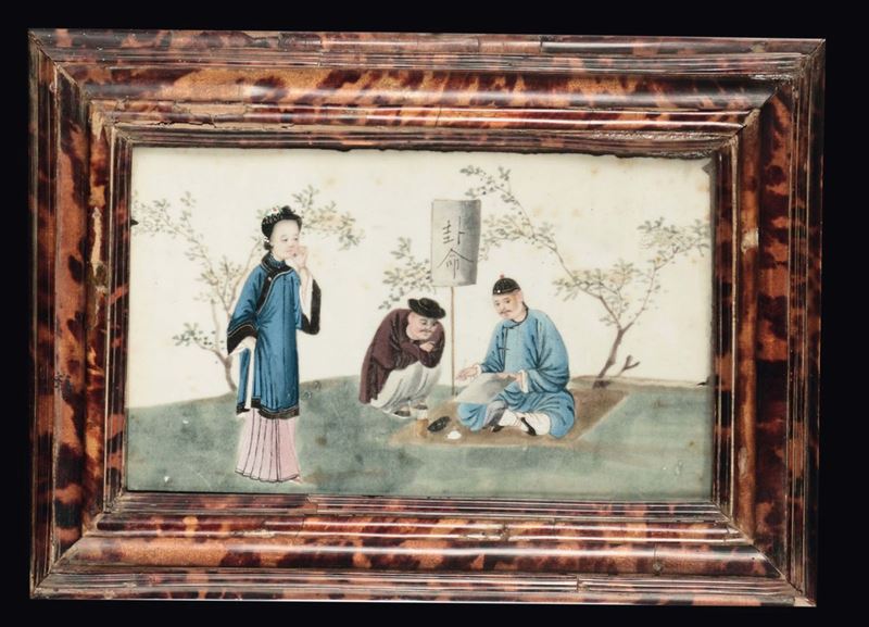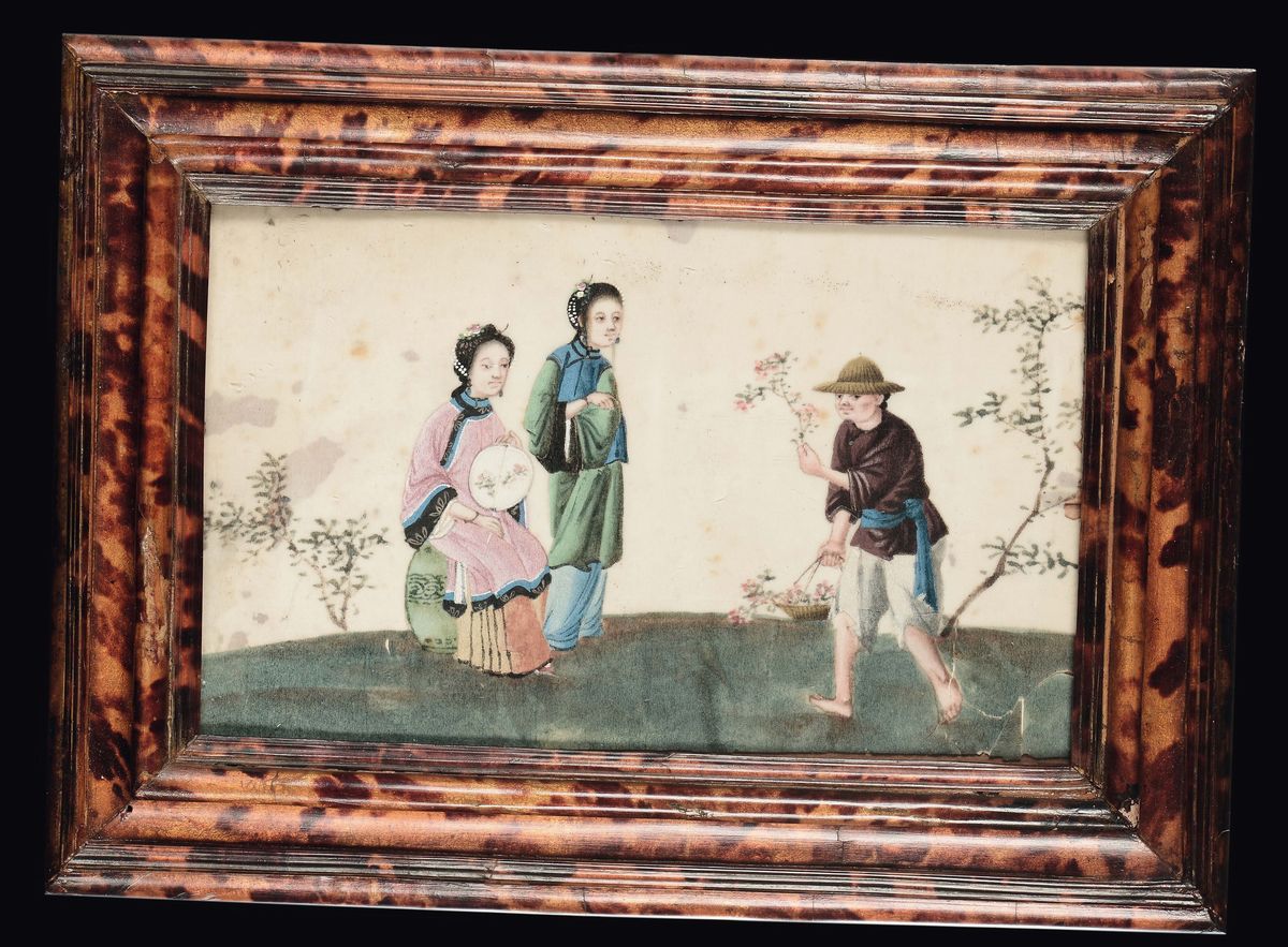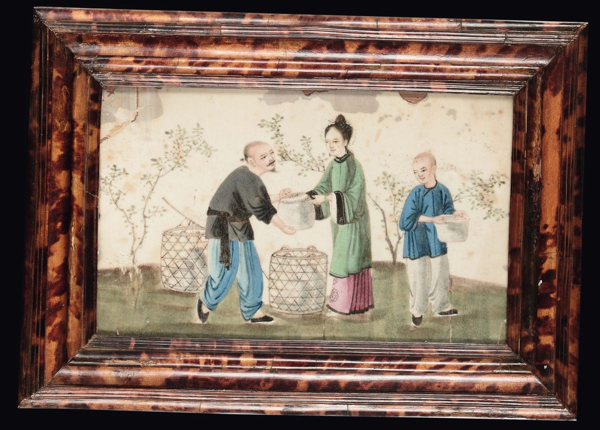 Quattro dipinti su carta di riso incorniciati raffiguranti scene di vita comune, Cina, inizio XX secolo