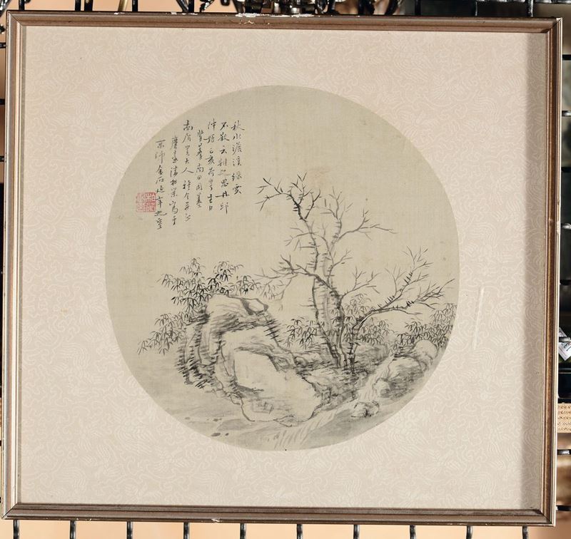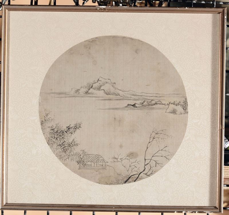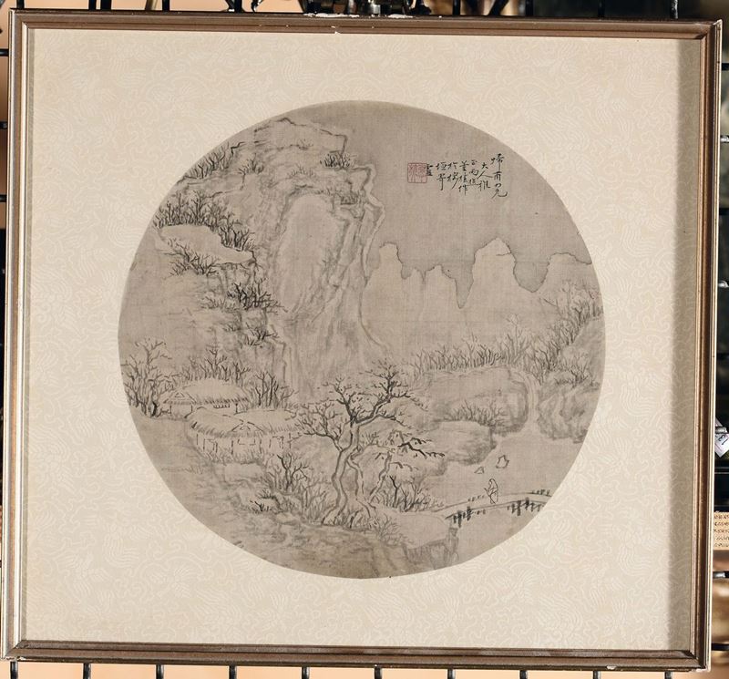 Quattro dipinti su seta di forma circolare incorniciati raffigurante paesaggi in cromia grigia con iscrizioni, Cina, Dinastia Qing, XIX secolo