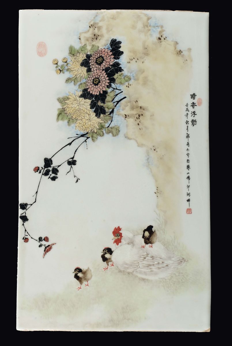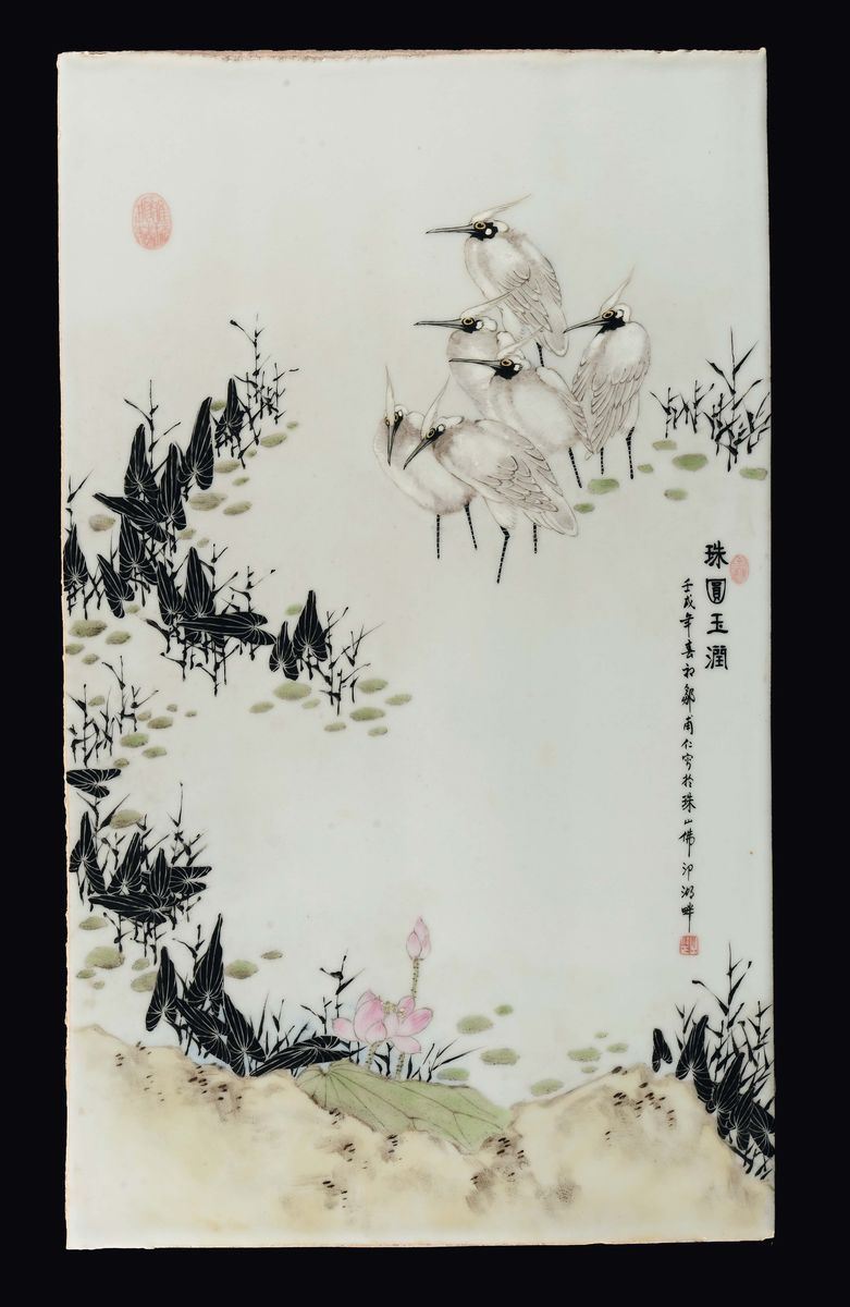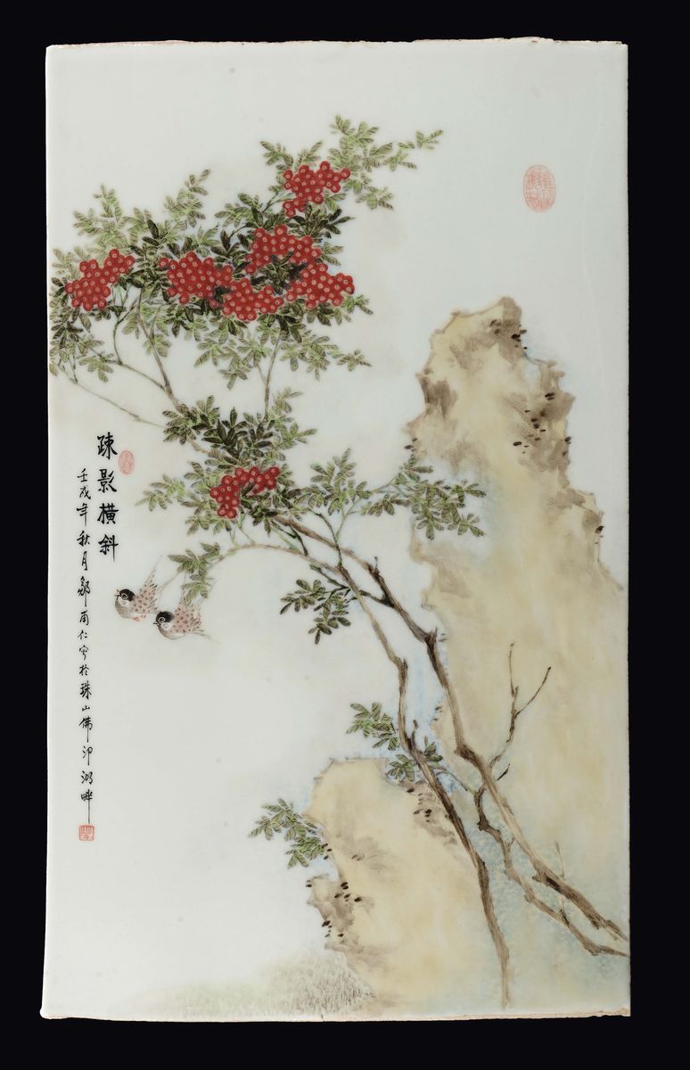 Quattro placche in porcellana policroma raffiguranti ognuna una specie di volatile diversa tra rami fioriti, Cina, XX sec [..]