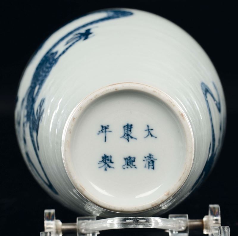 LOTTO RITIRATO Raro vaso in porcellana bianca e blu con decoro di draghi, Cina, Dinastia Qing, marca e del periodo Kangxi [..]