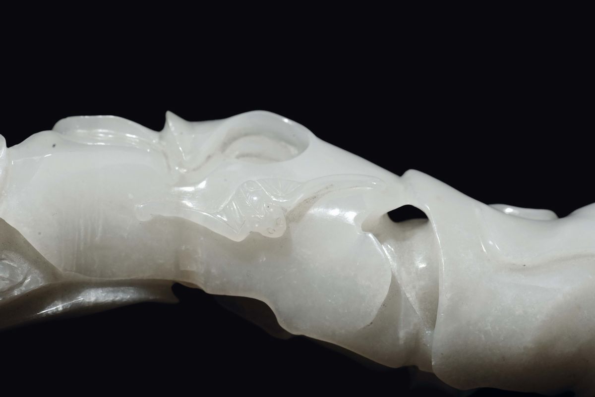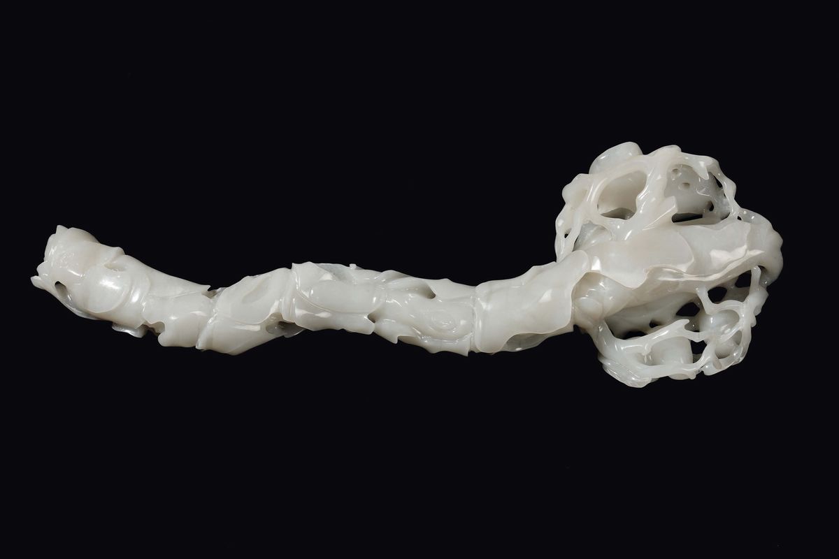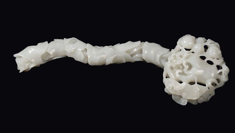 Ruyi finemente scolpito in giada bianca con ramages, frutti e pipistrelli a rilievo, Cina, Dinastia Qing, inizio XX secol [..]
