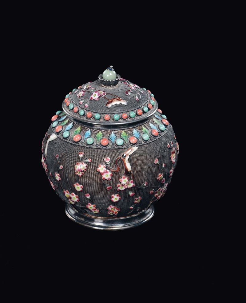 Scatola in silver a smalti cloisonné con coperchio in filigrana con fiori di ciliegio e pietre dure, Cina, Dinastia Qing, [..]