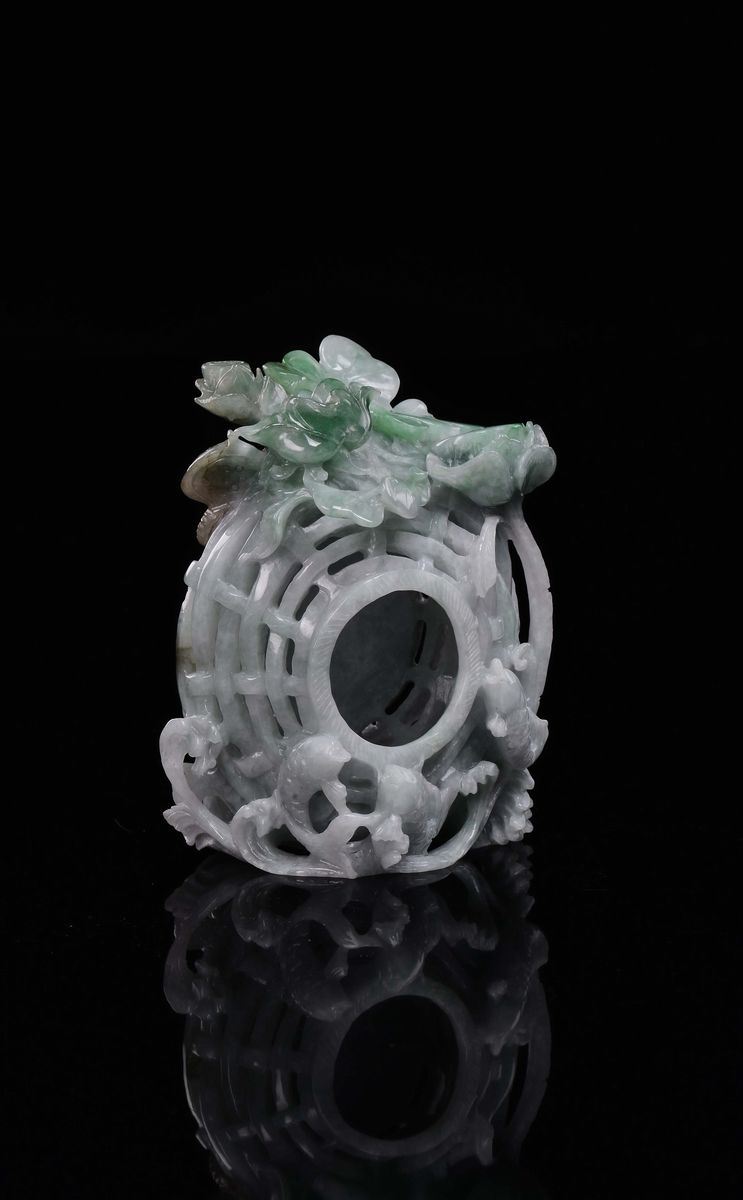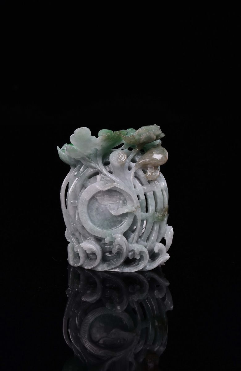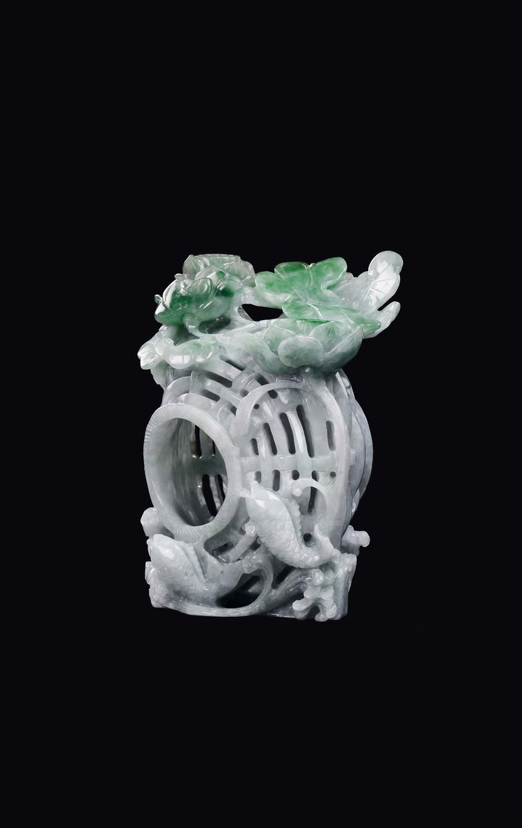 Sciacquapennelli in giada verde con decoro vegetale e pesci in rilievo, Cina, Dinastia Qing, XIX secolo
