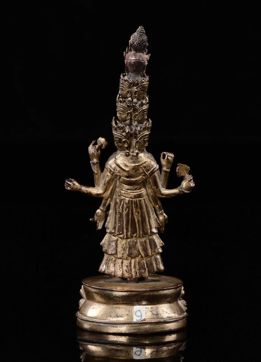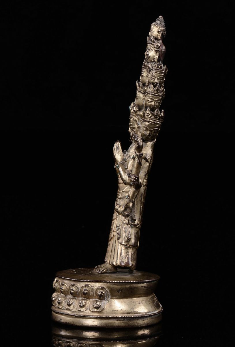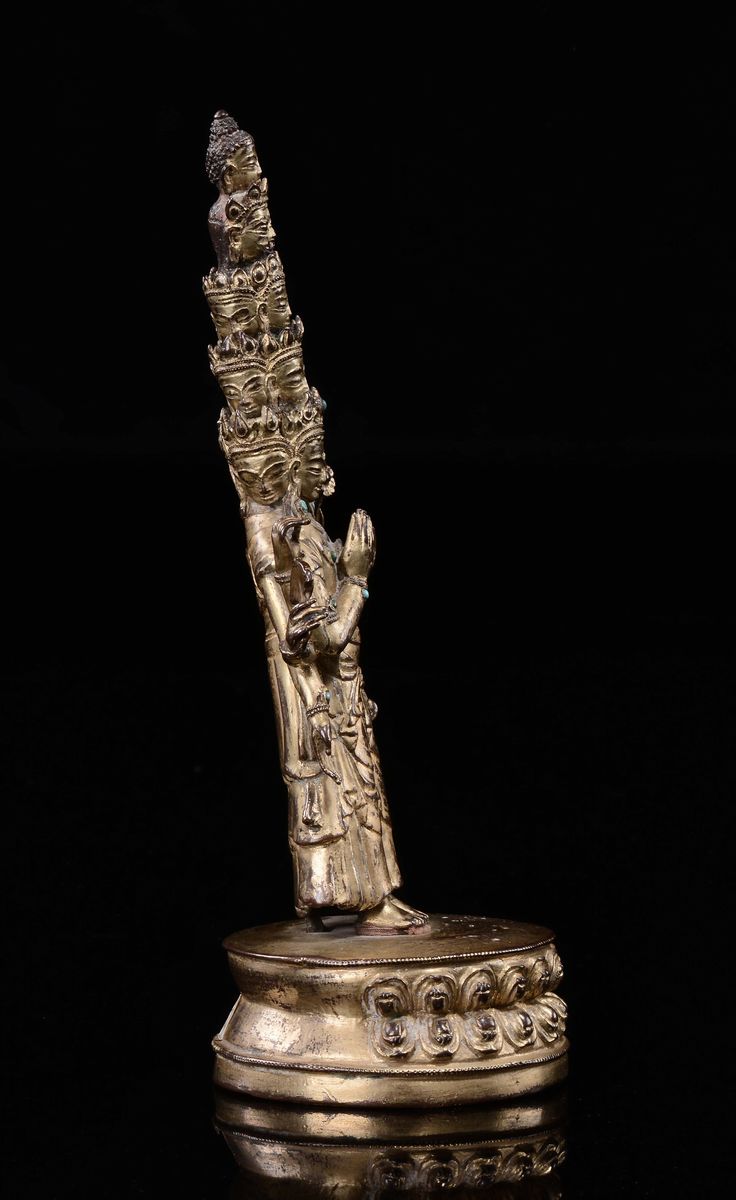 Scultura in bronzo dorato raffigurante Avalokitesvara a undici teste, Tibet, Dinastia Ming, XVIII secolo