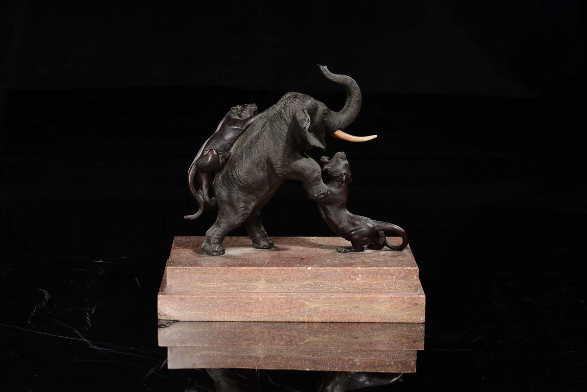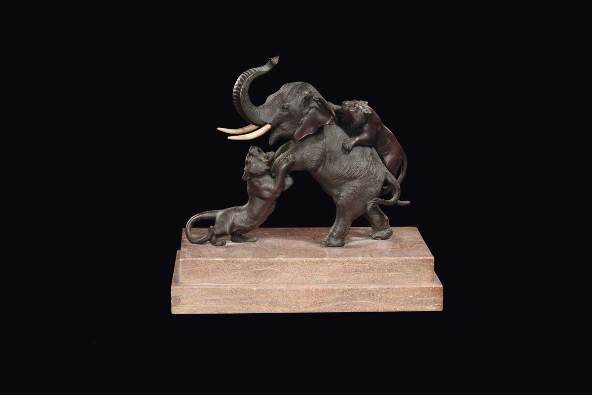Scultura in bronzo raffigurante elefante attaccato da due tigri, Giappone, epoca Meiji (1868-1912)
