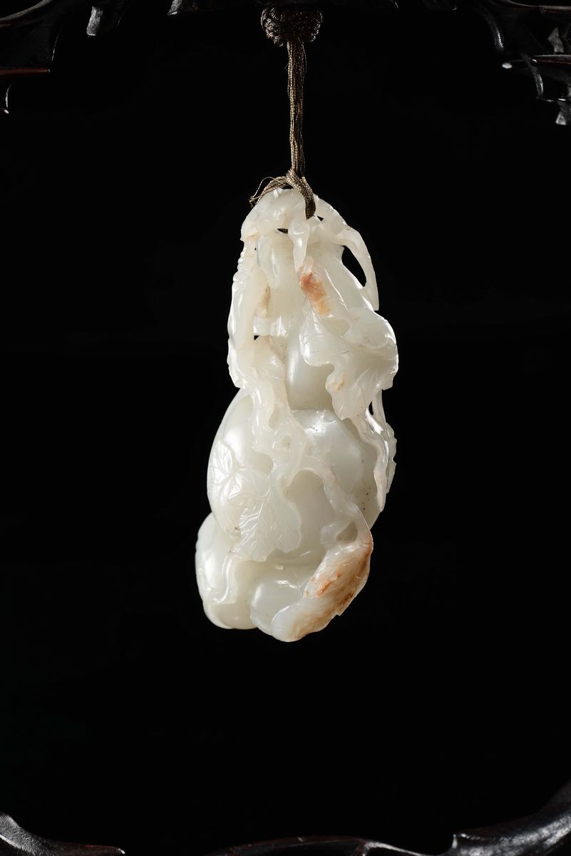 Scultura in giada bianca e russet scolpita a guisa di doppia zucca con ramages a rilievo su sostegno traforato in legno di homu, Cina, Dinastia Qing, epoca Qianlong (1736-1795)