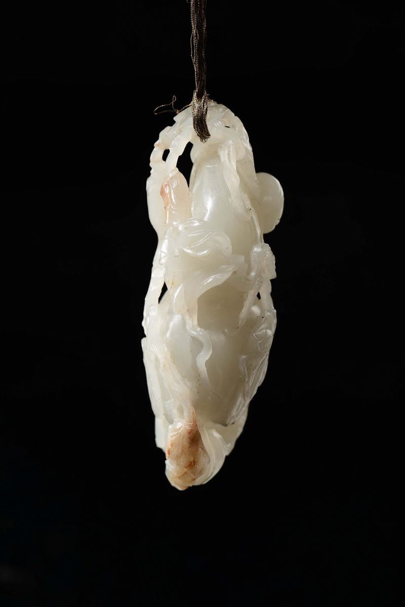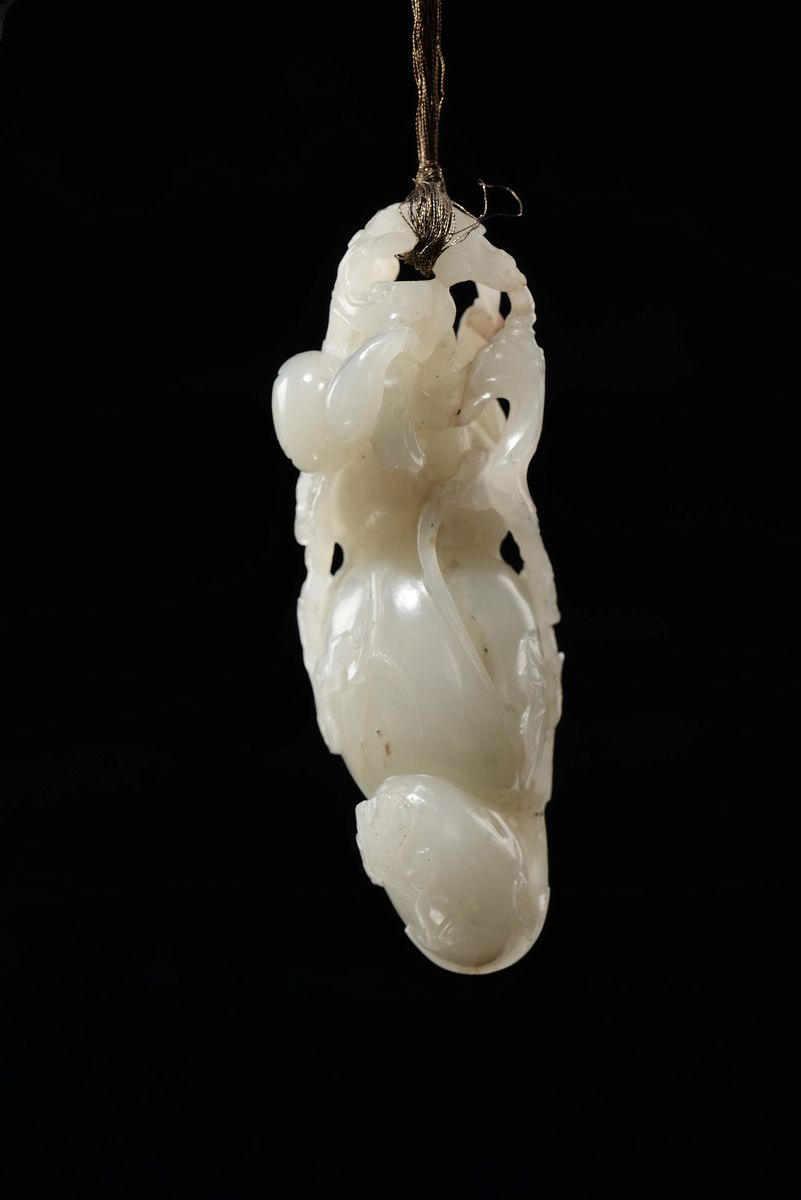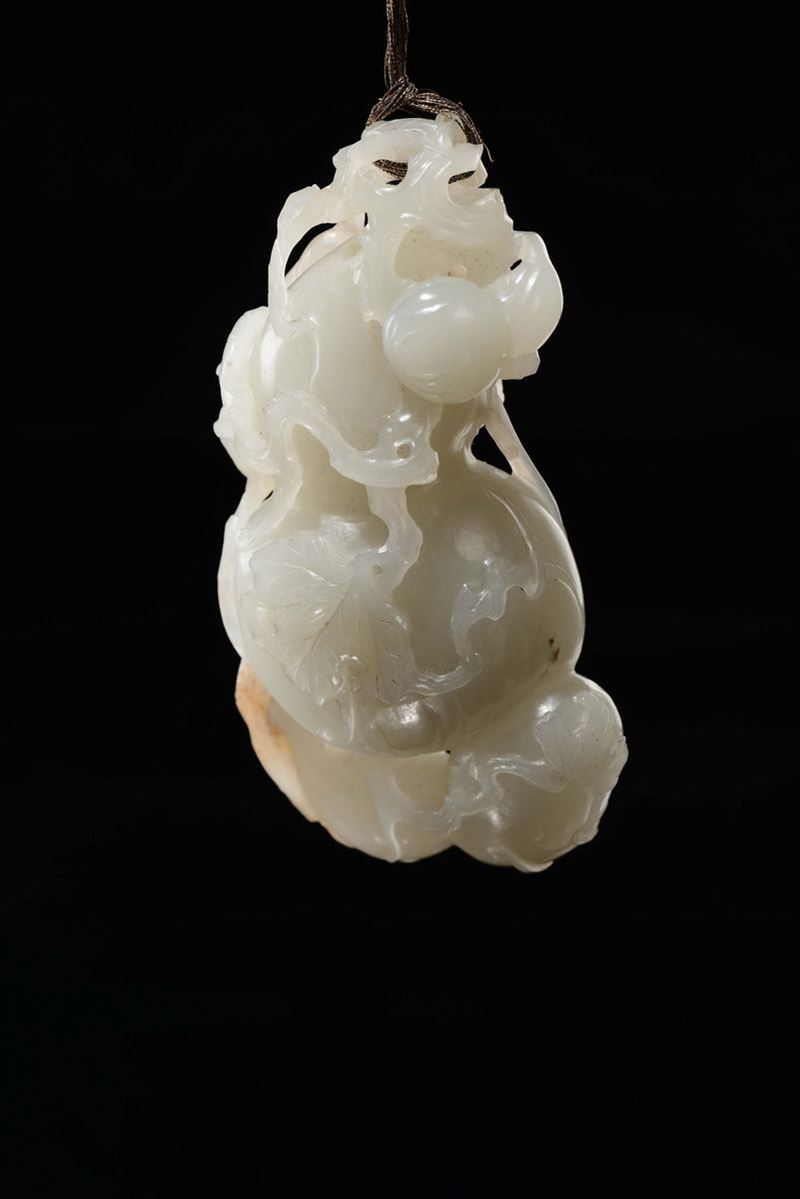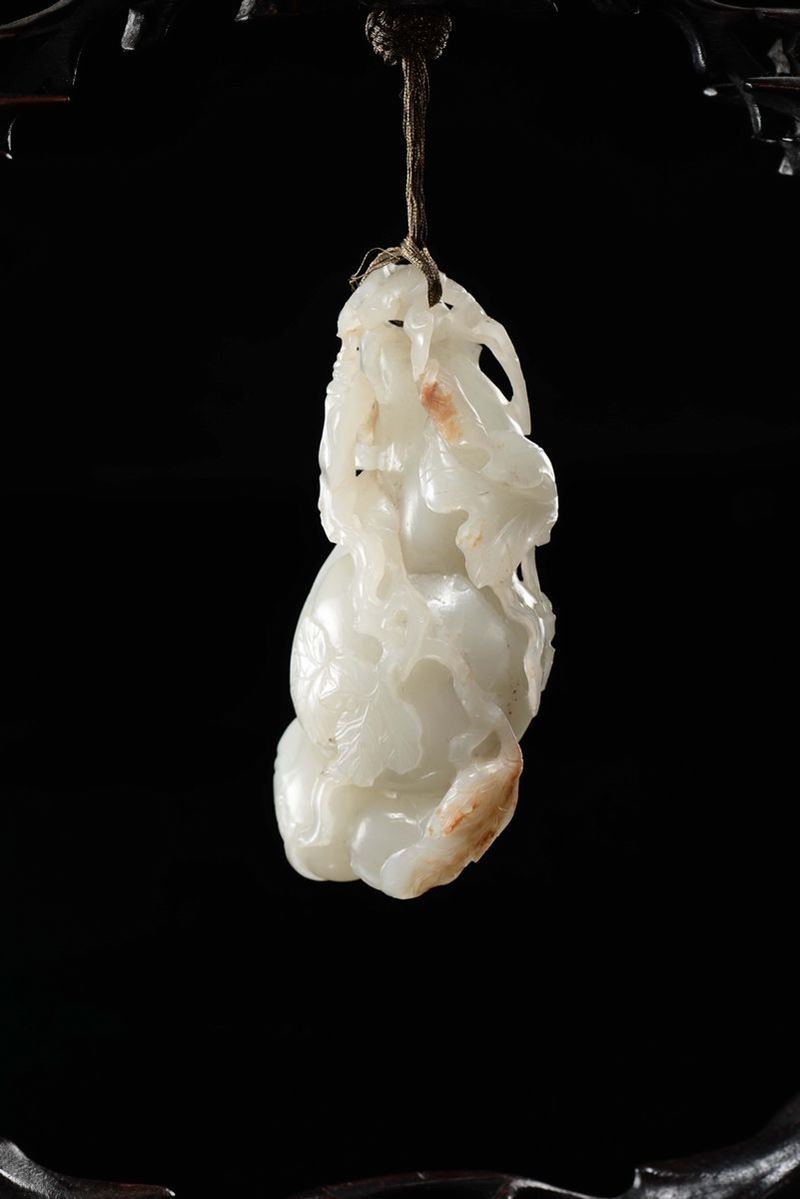 Scultura in giada bianca e russet scolpita a guisa di doppia zucca con ramages a rilievo su sostegno traforato in legno [..]