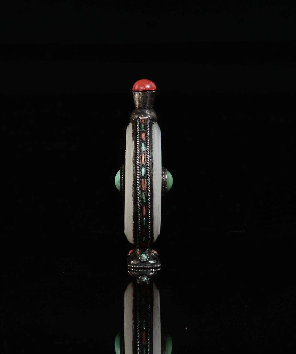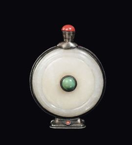 Snuff bottle circolare in giada bianca montata in argento con intarsi di pietre dure, Cina, Dinastia Qing, XIX secolo
