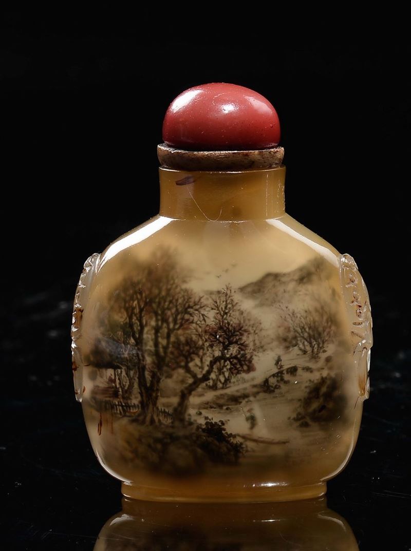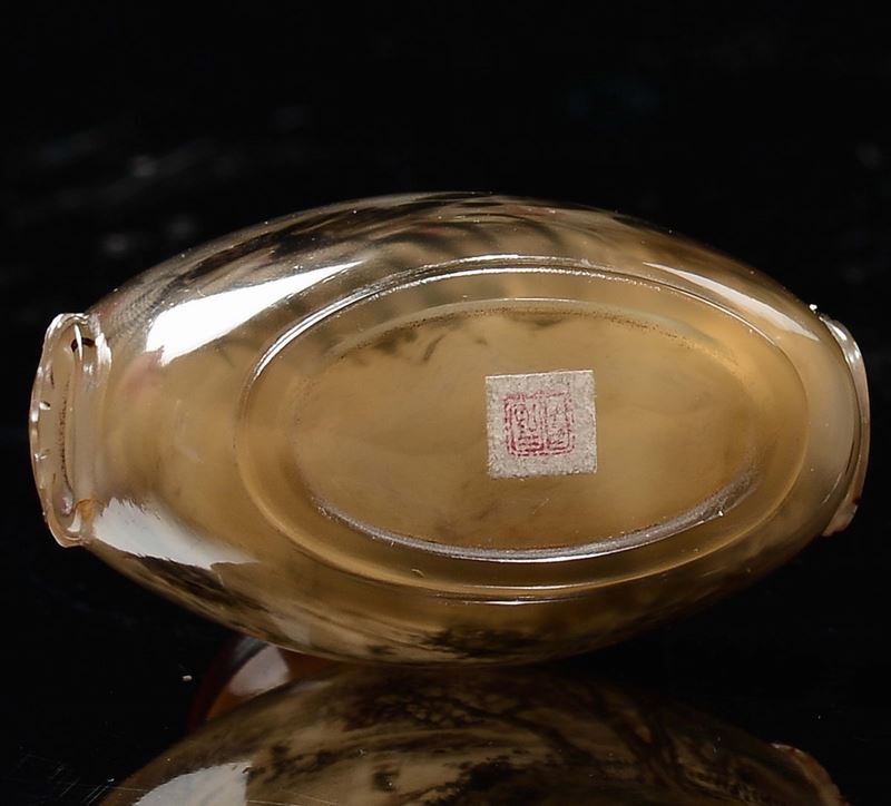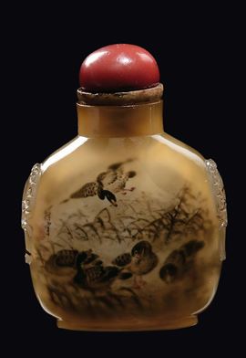 Snuff bottle in agata con paesaggio e anatre, Cina, Dinastia Qing, XIX secolo