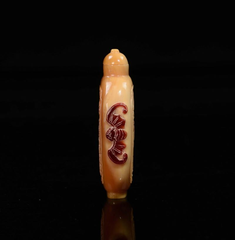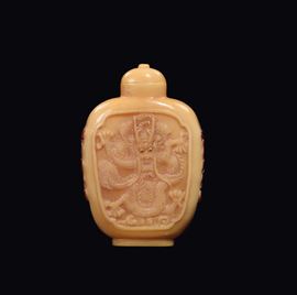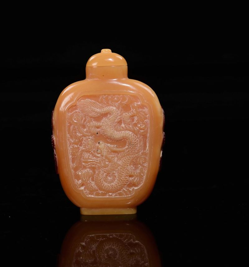 Snuff bottle in becco di tucano con draghi e pipistrelli rossi, Cina, Dinastia Qing, XIX secolo