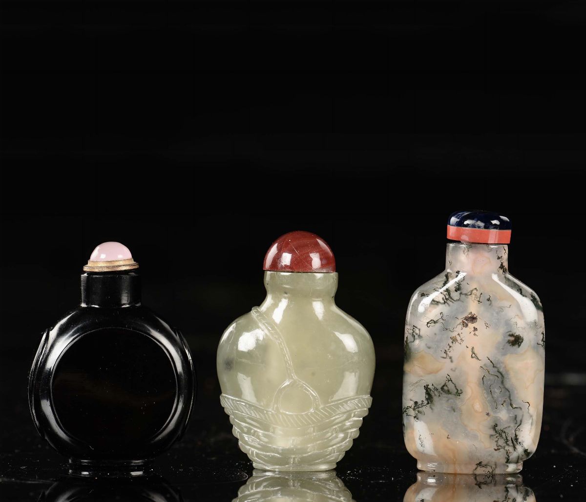 Tre snuff bottles in materiali vari, Cina, Dinastia Qing, XIX secolo