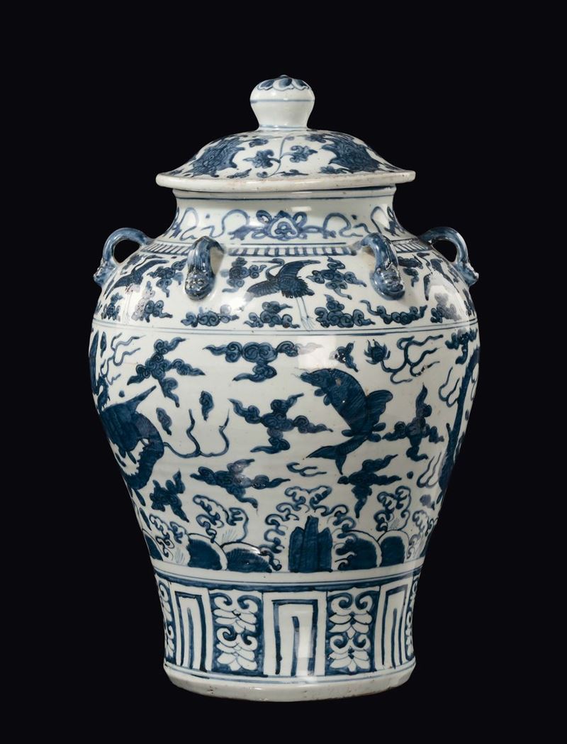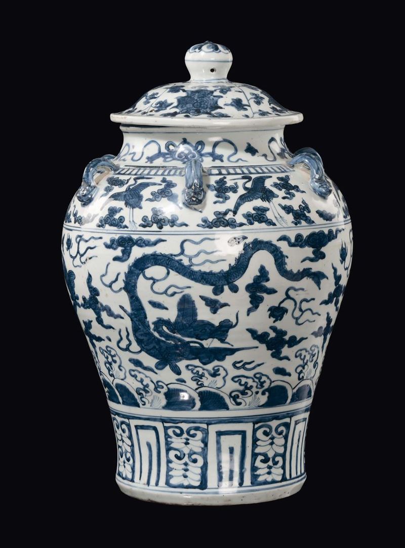 Vaso con un coperchio in porcellana bianca e blu con draghi, pesci e aironi, Cina, Dinastia Ming, epoca Wanli (1567-1572) [..]
