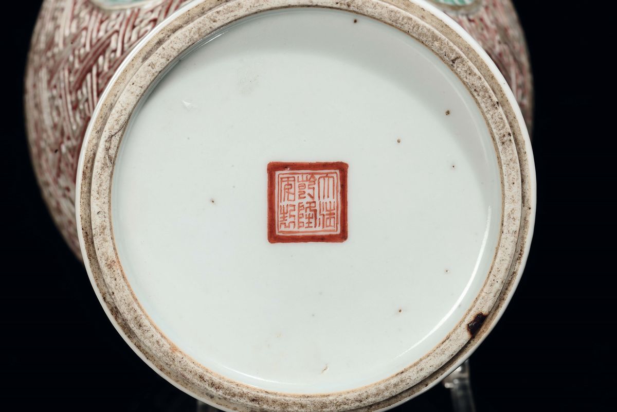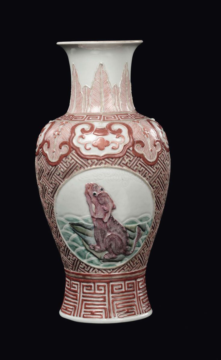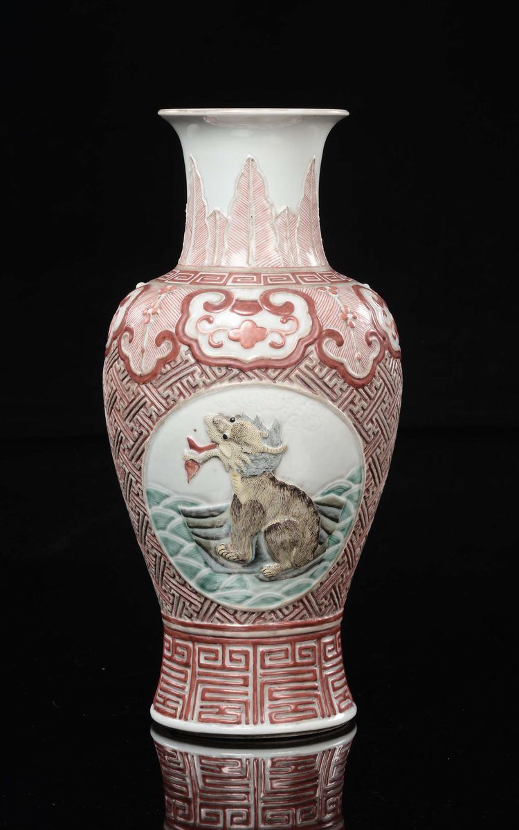 Vaso in porcellana policroma con decoro geometrico a rilievo e cani di Pho entro riserve, Cina, Dinastia Qing, XIX secolo [..]