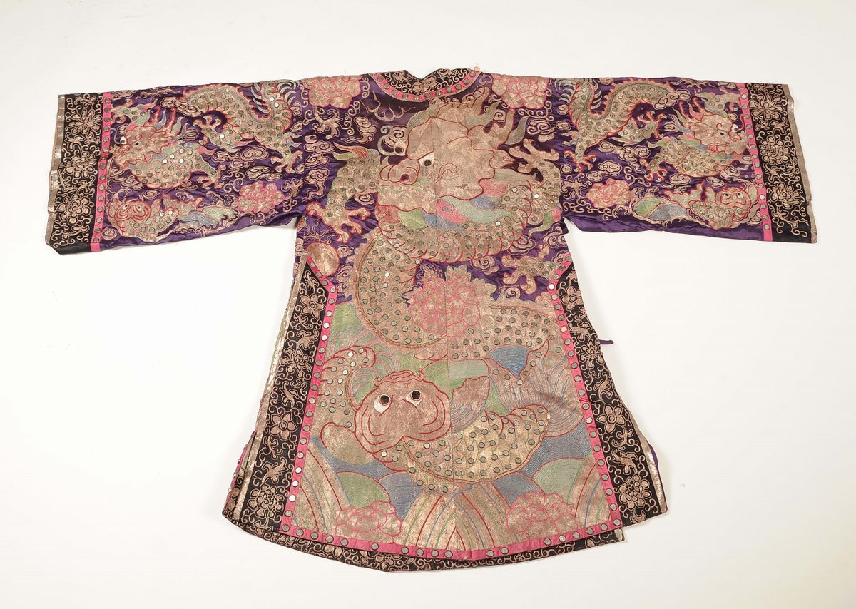 Veste in seta a fondo viola con ricamato dragone dorato e con piccoli specchietti applicati, Cina, Dinastia Qing, inizio [..]