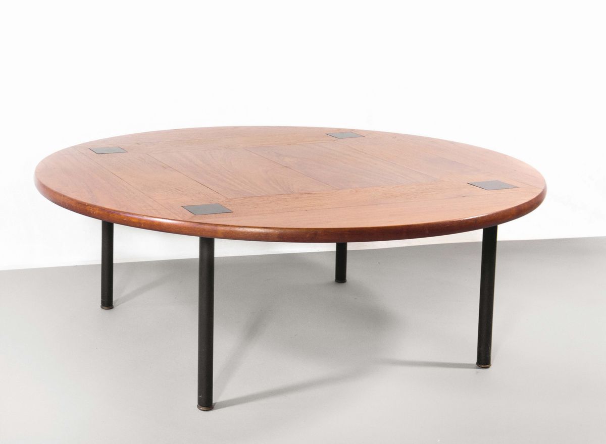 Tavolino in teak, borchie fuse in bronzo, gambe in metallo laccato.Prod. Poltronova 1959, diam cm 105, altezza cm 38