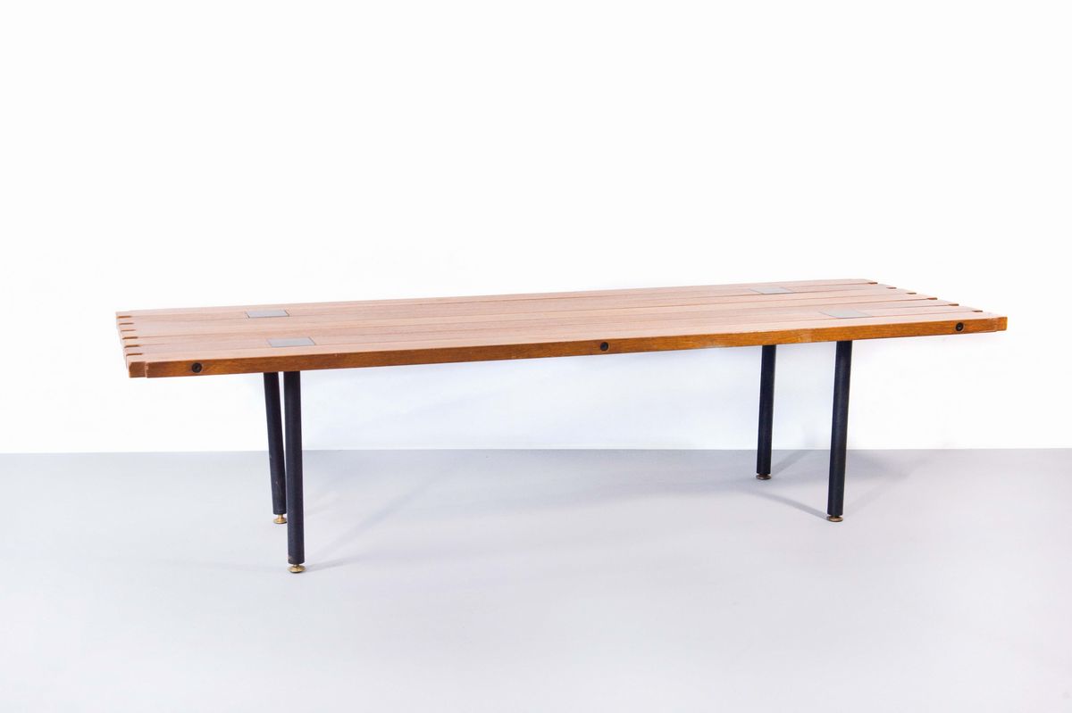 Tavolino in teak, borchie fuse in bronzo, gambe in metallo laccatoProd. Poltronova 1959, cm 152x49x38