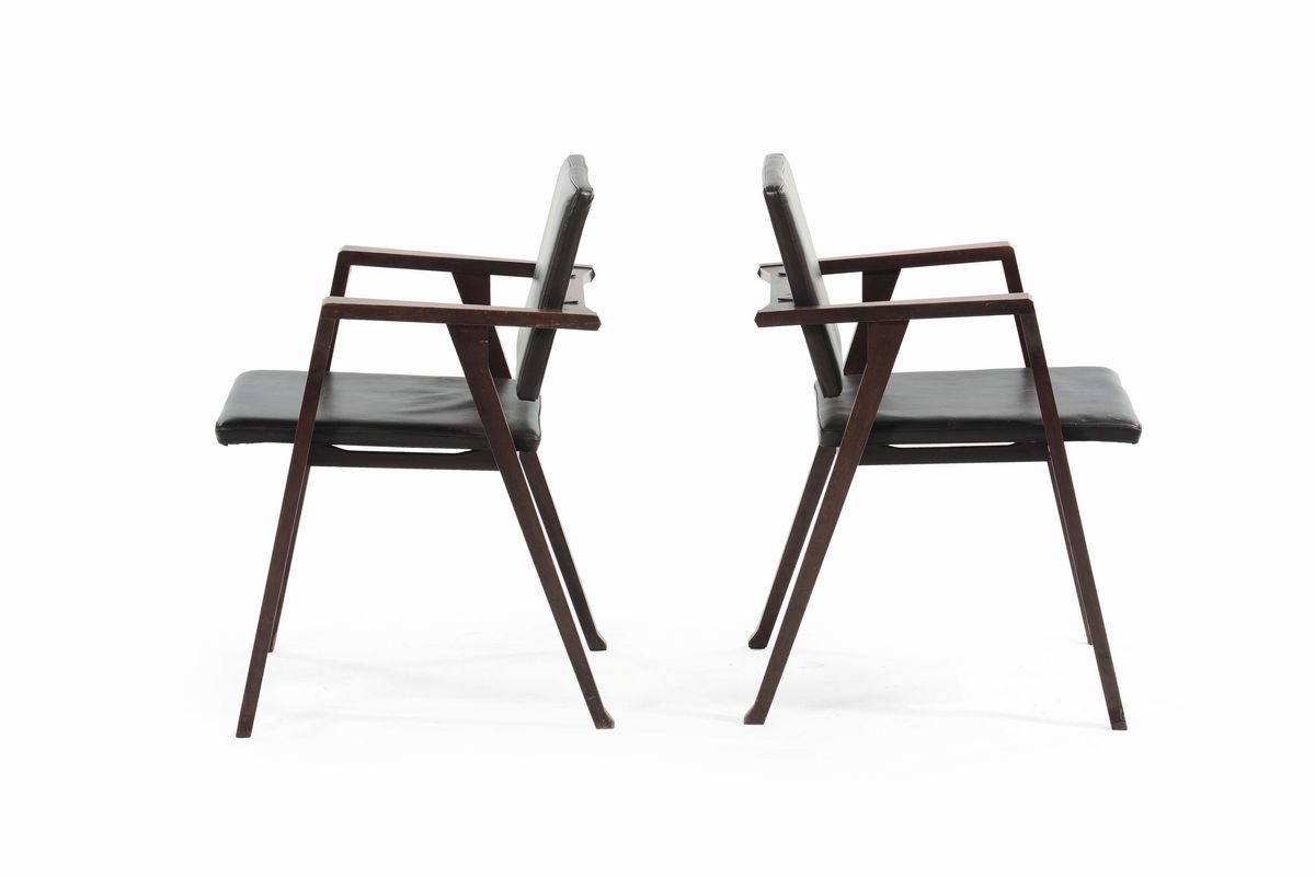 due poltroncine in legno massiccio con rivestimento in pelleProd. Poggi 1950.Premio compasso d’ oro 1955, cm 55x55x76