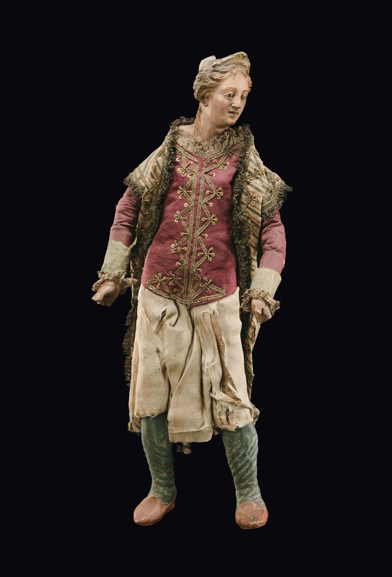 manichino in legno, occhi di vetro, vestitura originale, altezza cm 30 e cm 36
