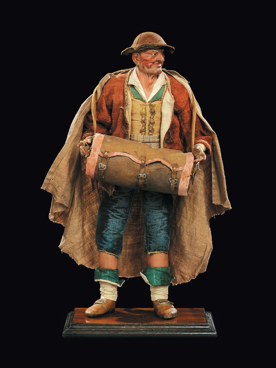 Vecchio contadinotesta in terracotta, mani e piedi in legno intagliato e dipinto in policromia, occhi in vetro, manichino in fil di ferro ricoperto di stoppa, Napoli inizi XIX secolo, altezza cm 52 circa (attribuzione ad opera del professor Teodoro Fitipaldi)